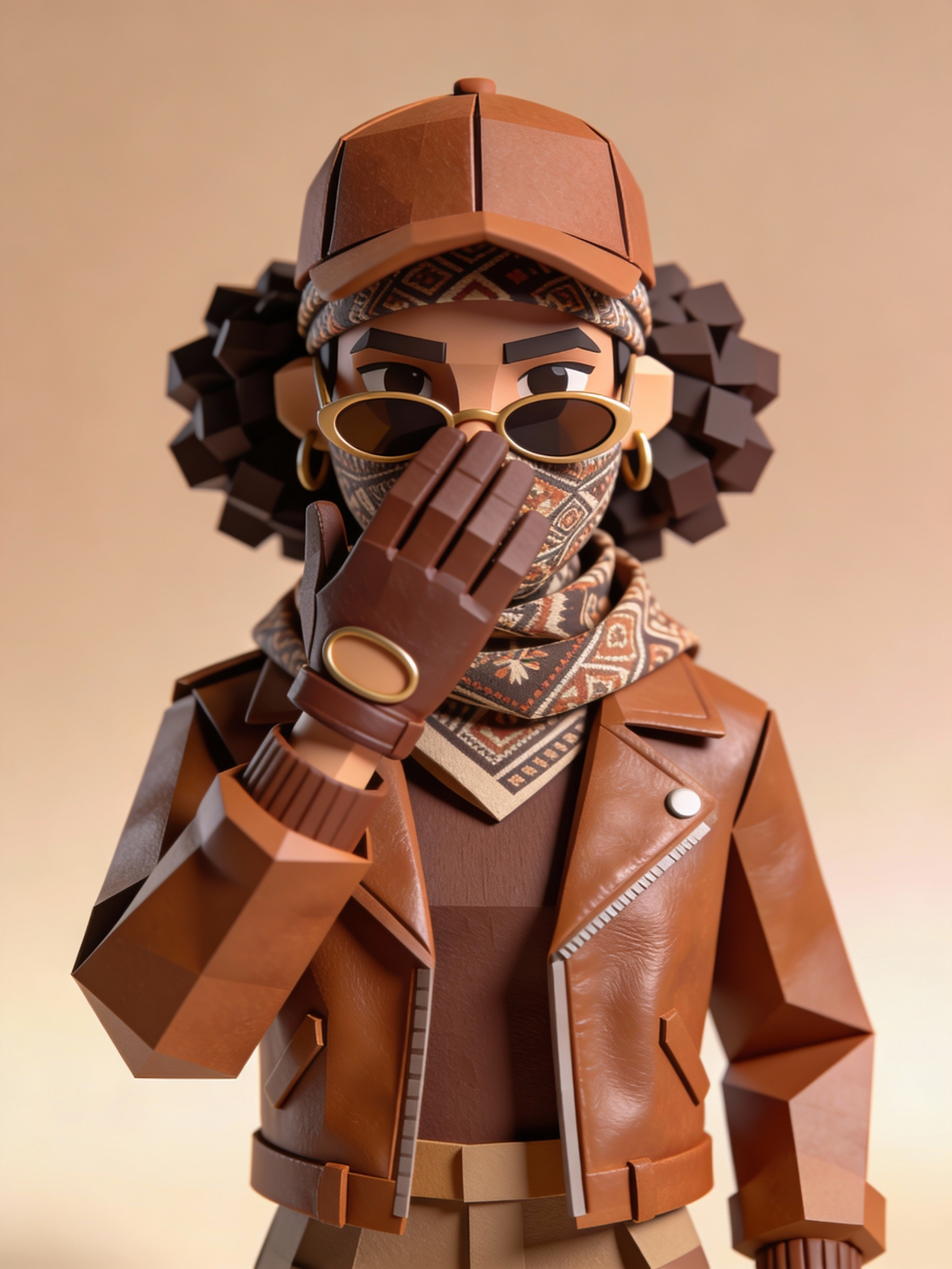 Stylized 3D character in a brown leather jacket, scarf, and cap, with geometric hair and sunglasses, exuding a modern, artistic vibe.