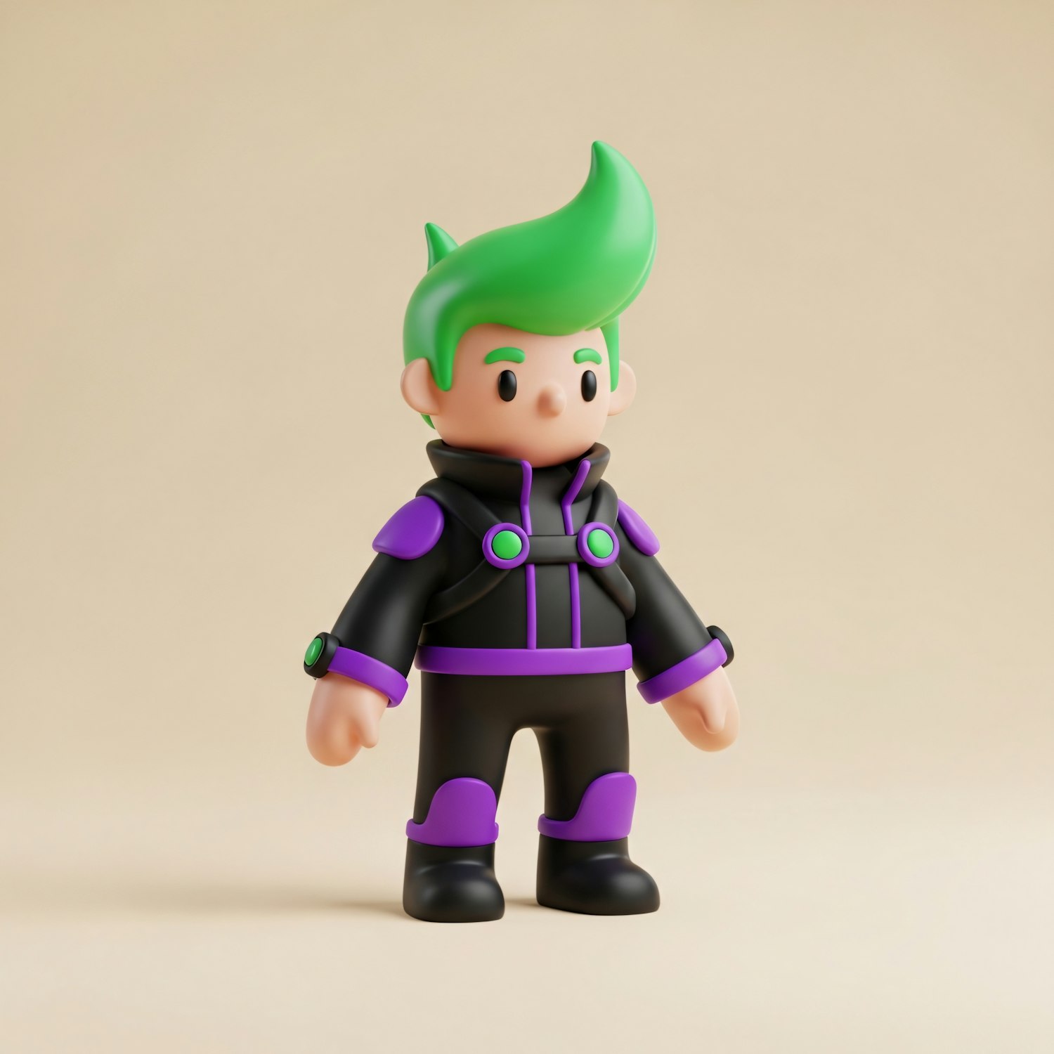 A vibrant 3D character with green hair and a black and purple outfit, showcasing a playful and modern design against a neutral background.