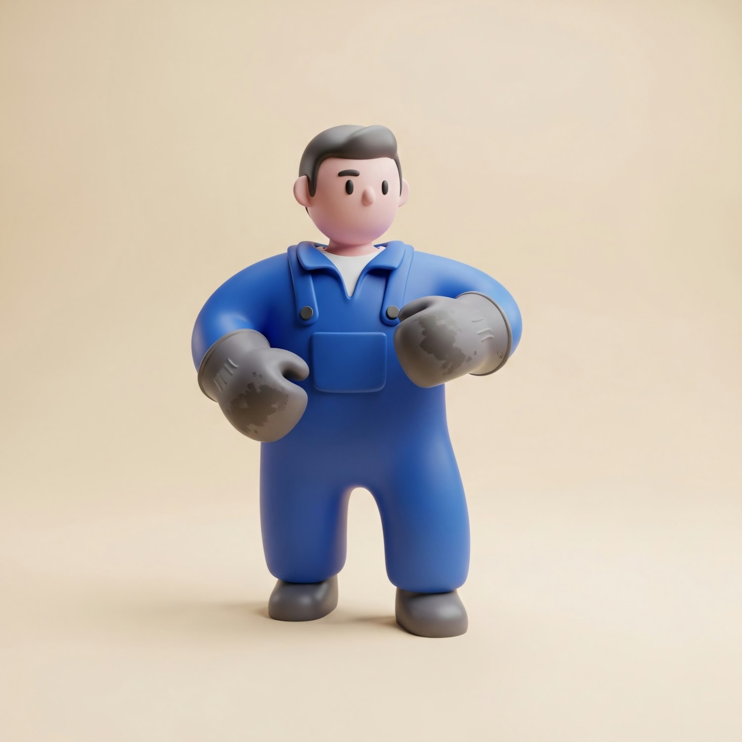 A 3D cartoon character in a blue jumpsuit with gloves and boots, standing against a neutral background, showcasing a clean design.