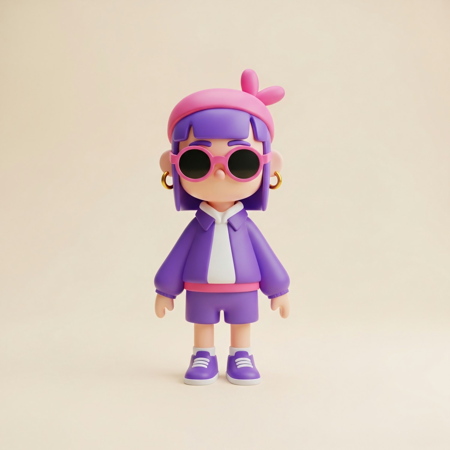 A cute 3D character with purple hair, pink sunglasses, and a stylish purple outfit, set against a neutral background.