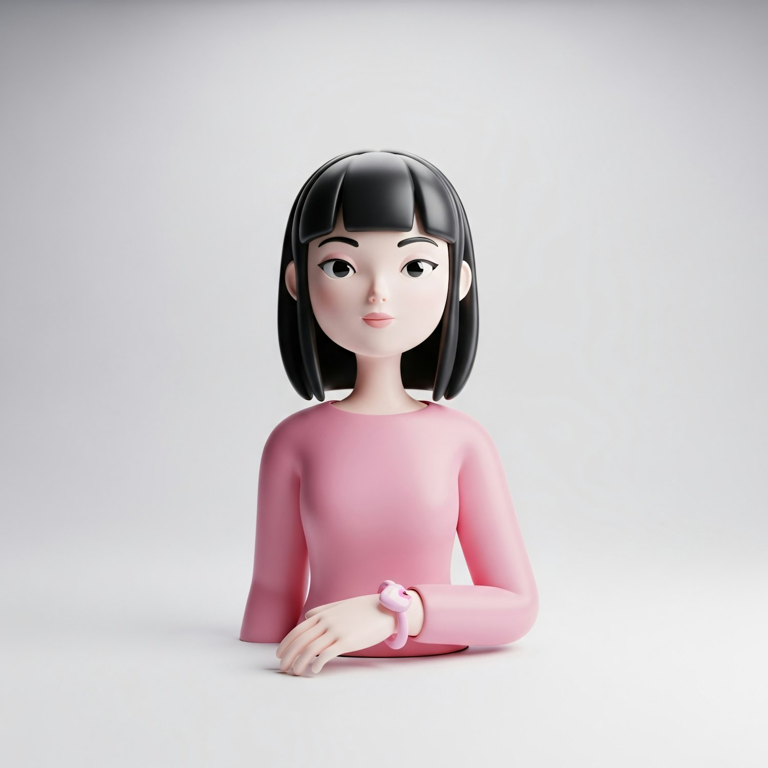 A 3D illustration of a character with black hair, pink attire, and a matching wrist accessory, set against a neutral background.