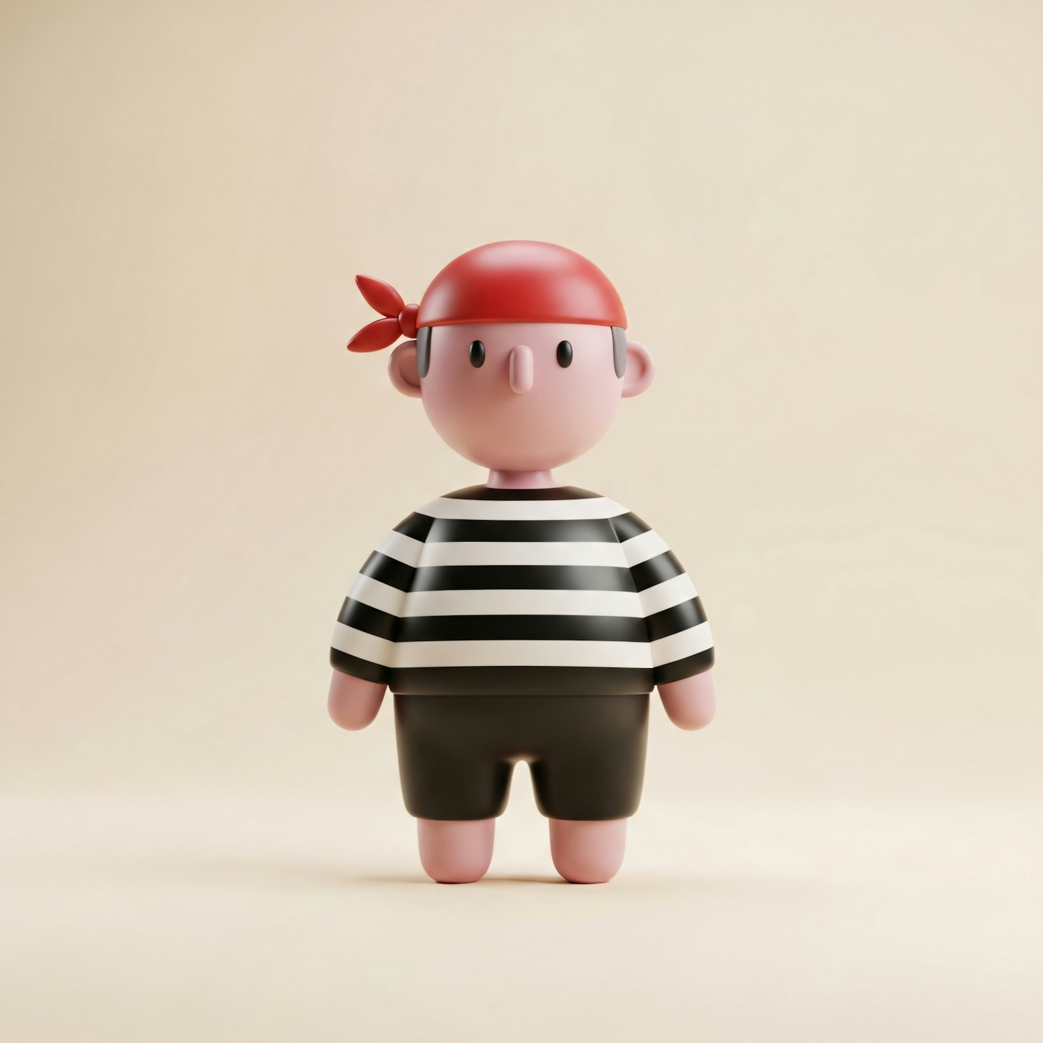 A cute 3D character with a red bandana and striped shirt, designed in a minimalist and playful style against a neutral background.