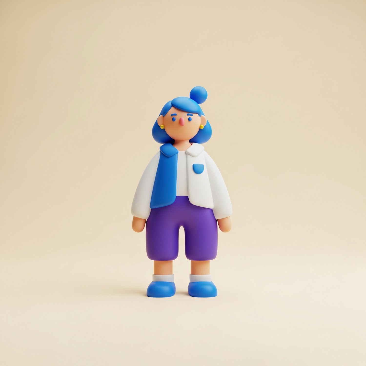 A colorful 3D character with blue hair, white shirt, purple shorts, and blue shoes, set against a beige background.