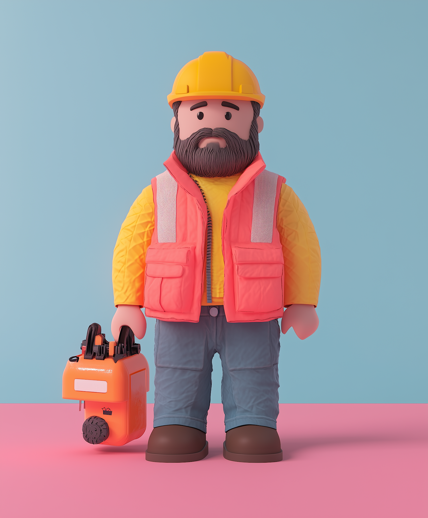 3D cartoon construction worker with beard, hard hat, and safety vest holding a toolbox. Vibrant colors on a pastel background.