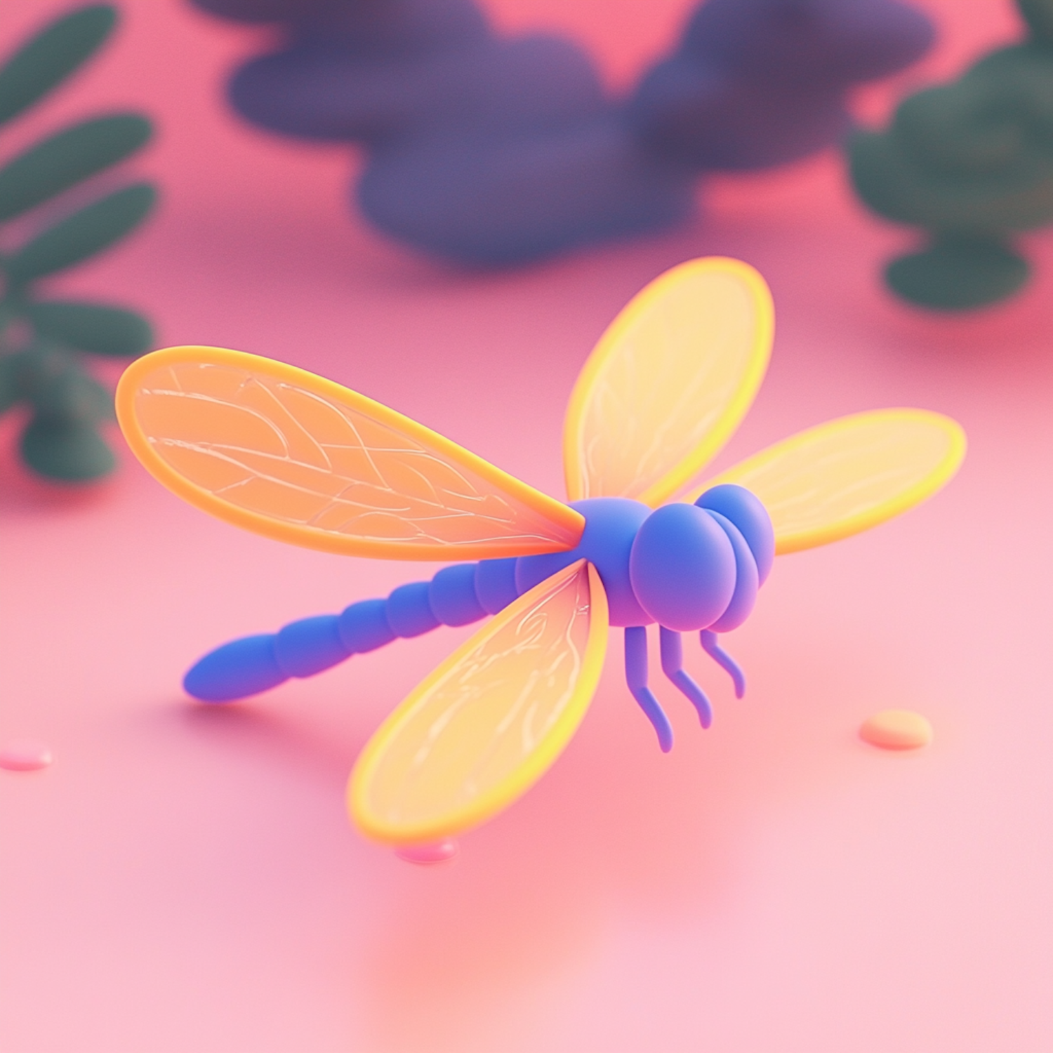 Colorful 3D dragonfly illustration with blue body and yellow wings on a pink background, surrounded by abstract foliage shapes.