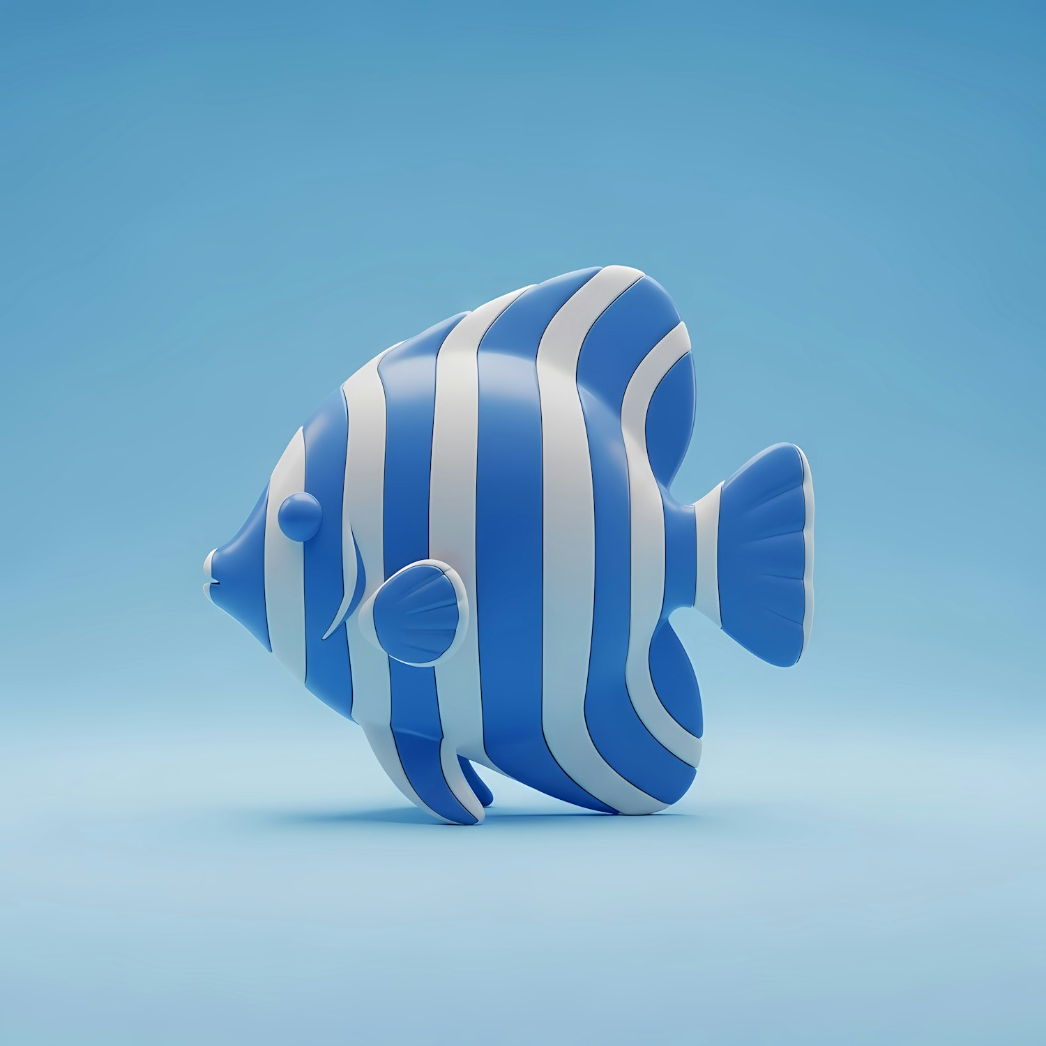 A 3D-rendered fish with blue and white stripes on a gradient blue background, showcasing a modern and minimalistic design.