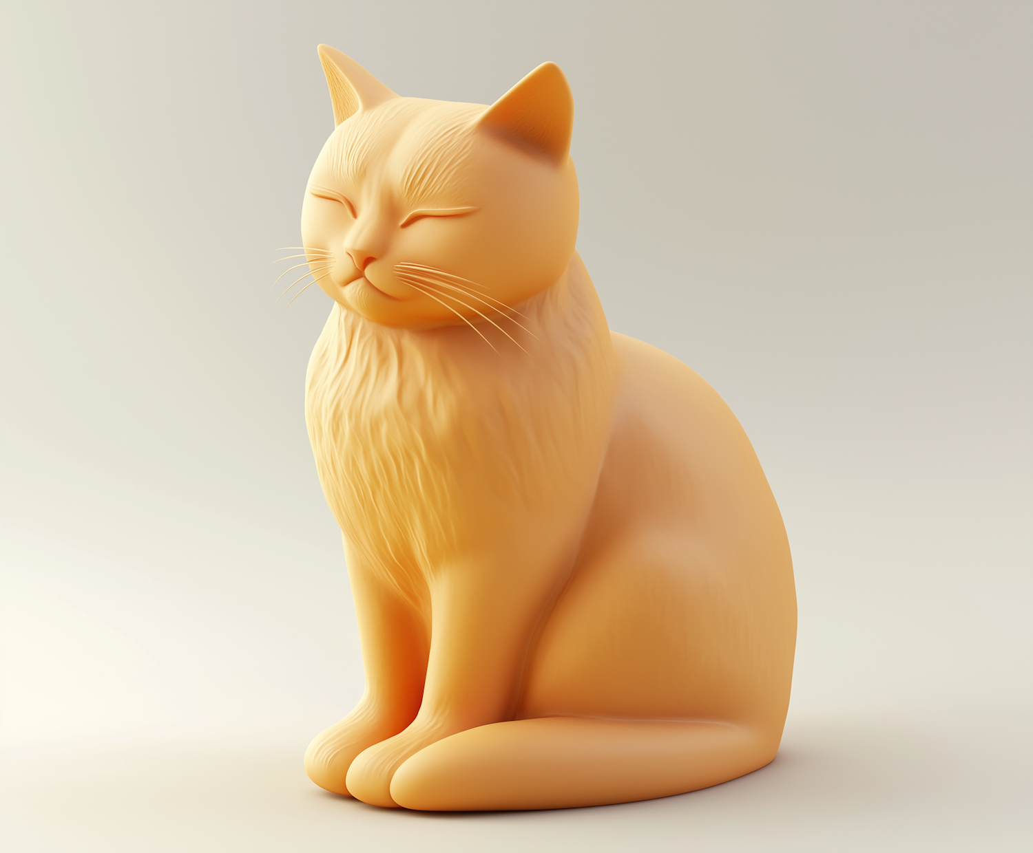 3D-rendered golden-yellow cat sitting upright with closed eyes, detailed fur texture, and a serene expression on a neutral background.