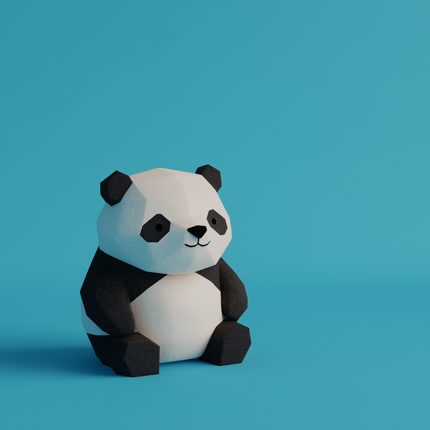 Stylized low-poly panda against a turquoise background, featuring geometric design and charming expression.