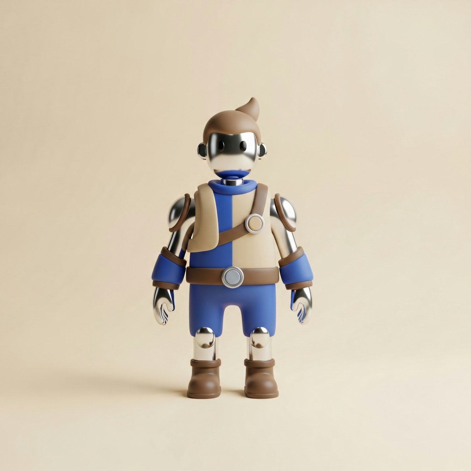 A 3D-rendered robotic character in a blue and beige outfit with metallic features, standing against a neutral background.