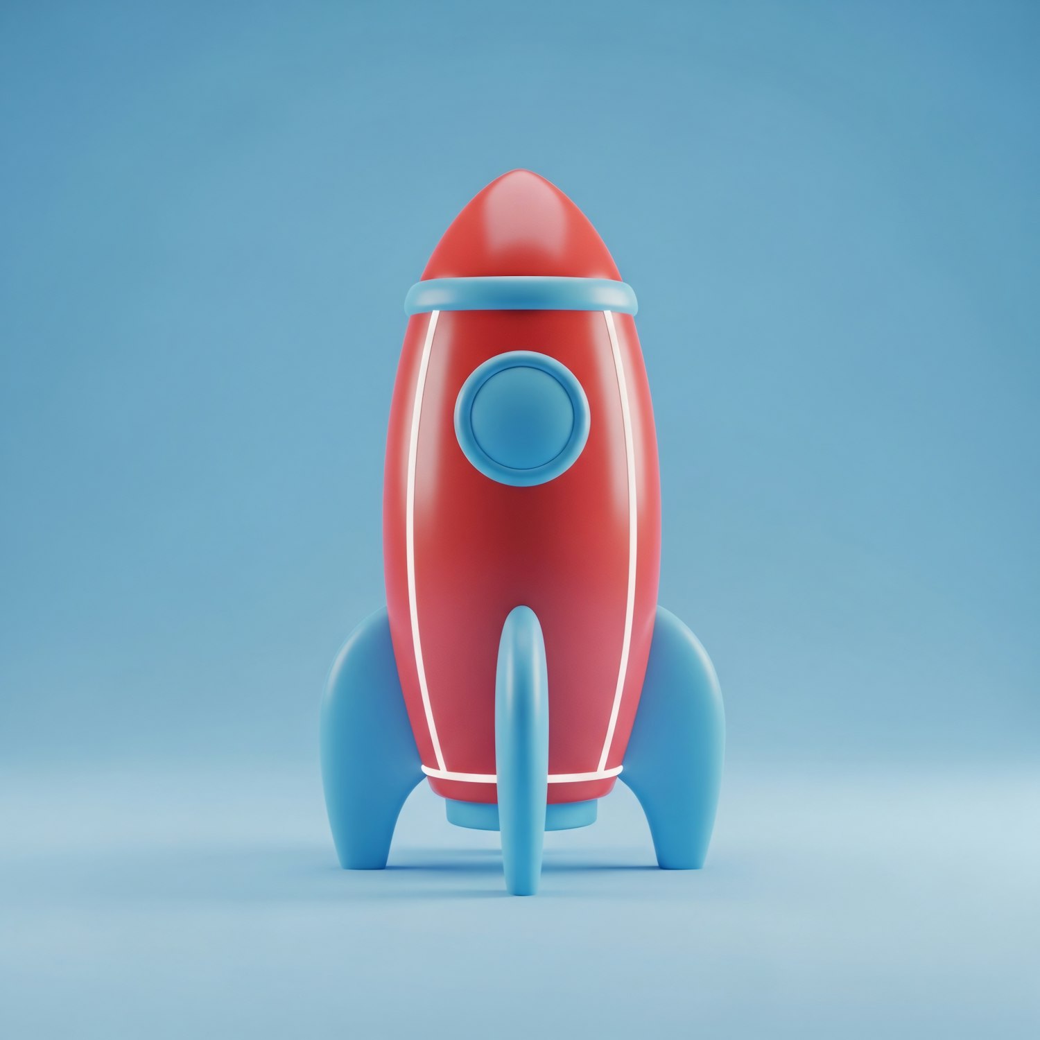 A vibrant 3D-rendered rocket with a red body and blue accents, set against a gradient blue background, showcasing a playful design.