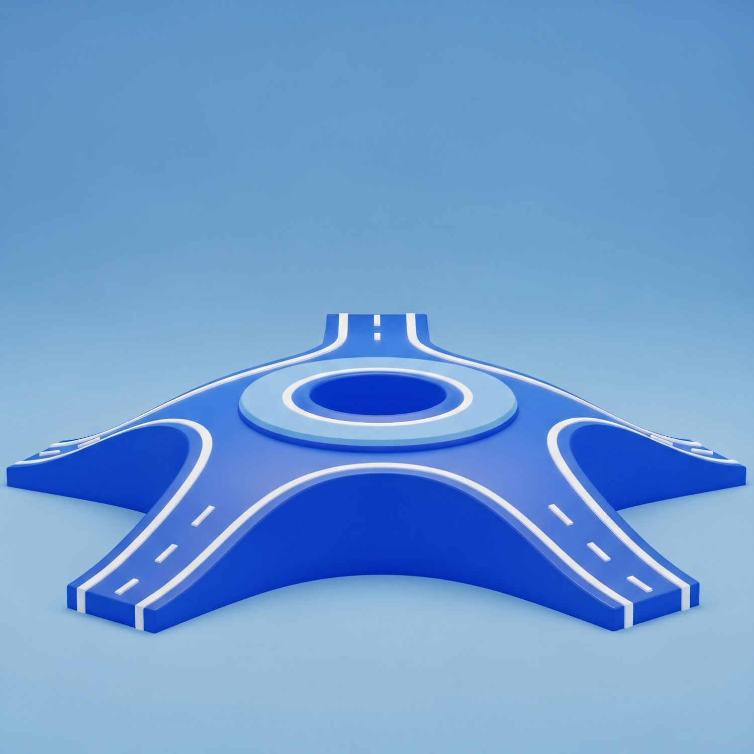 A vibrant 3D model of a blue roundabout with five roads, featuring clean lines and a minimalistic design against a light blue background.