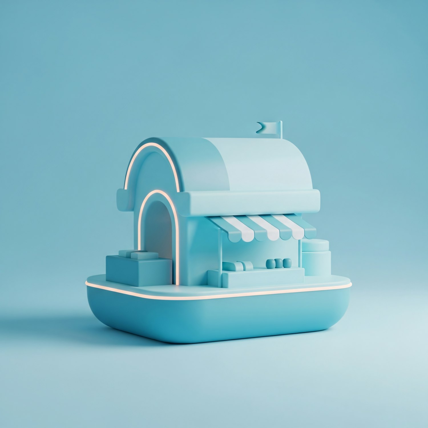 A minimalist 3D model of a small shop in a monochromatic blue design, featuring a rounded roof and striped awning.