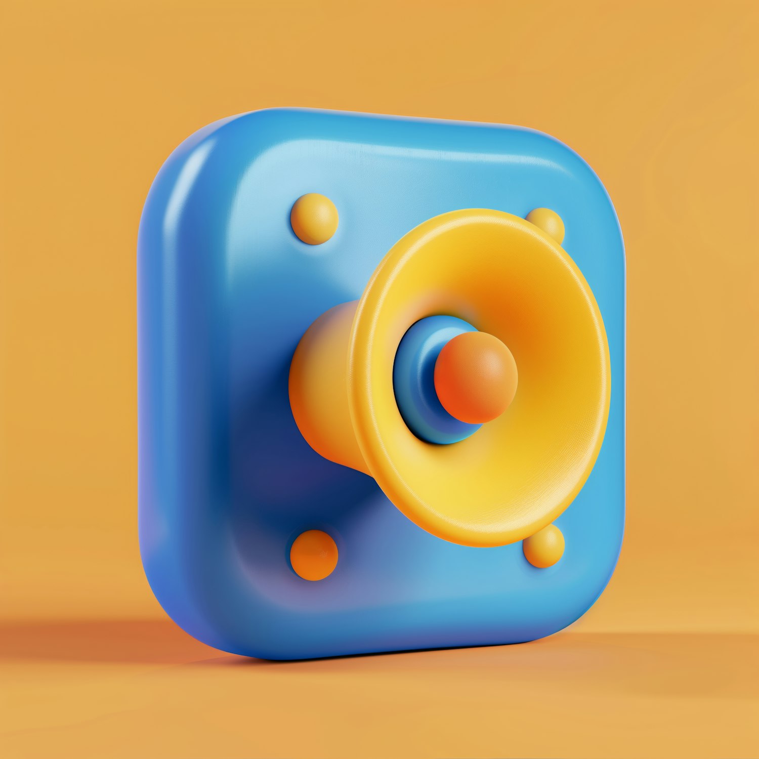 Vibrant 3D illustration of a stylized speaker icon with blue, yellow, and orange colors on an orange background.