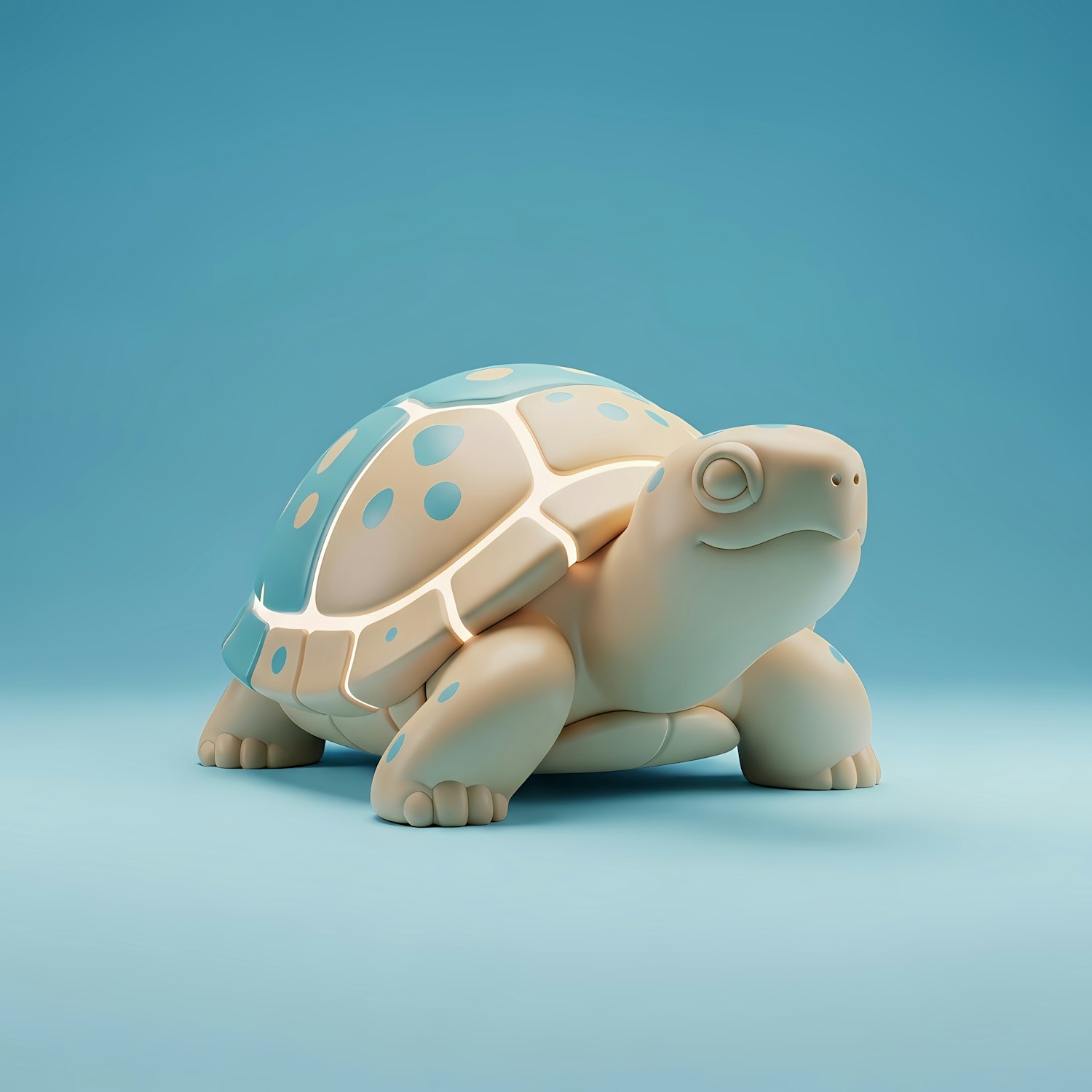 A charming 3D-rendered turtle with a polka-dotted shell in light blue and beige tones, set against a clean blue background.