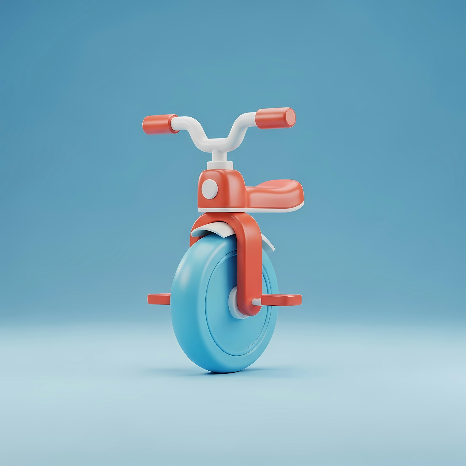 Bright 3D illustration of a colorful unicycle with a blue wheel and orange accents, set against a clean blue background.