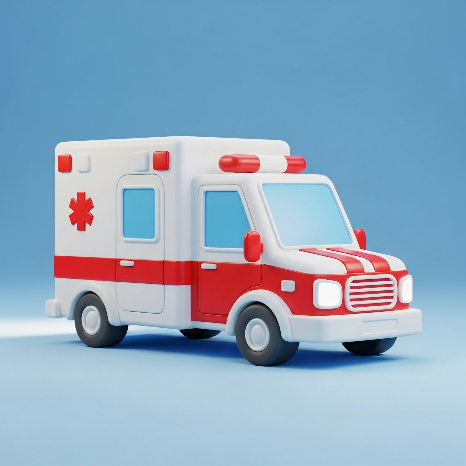 A vibrant 3D illustration of a cartoon-style ambulance with red and white details, set against a clean blue background.