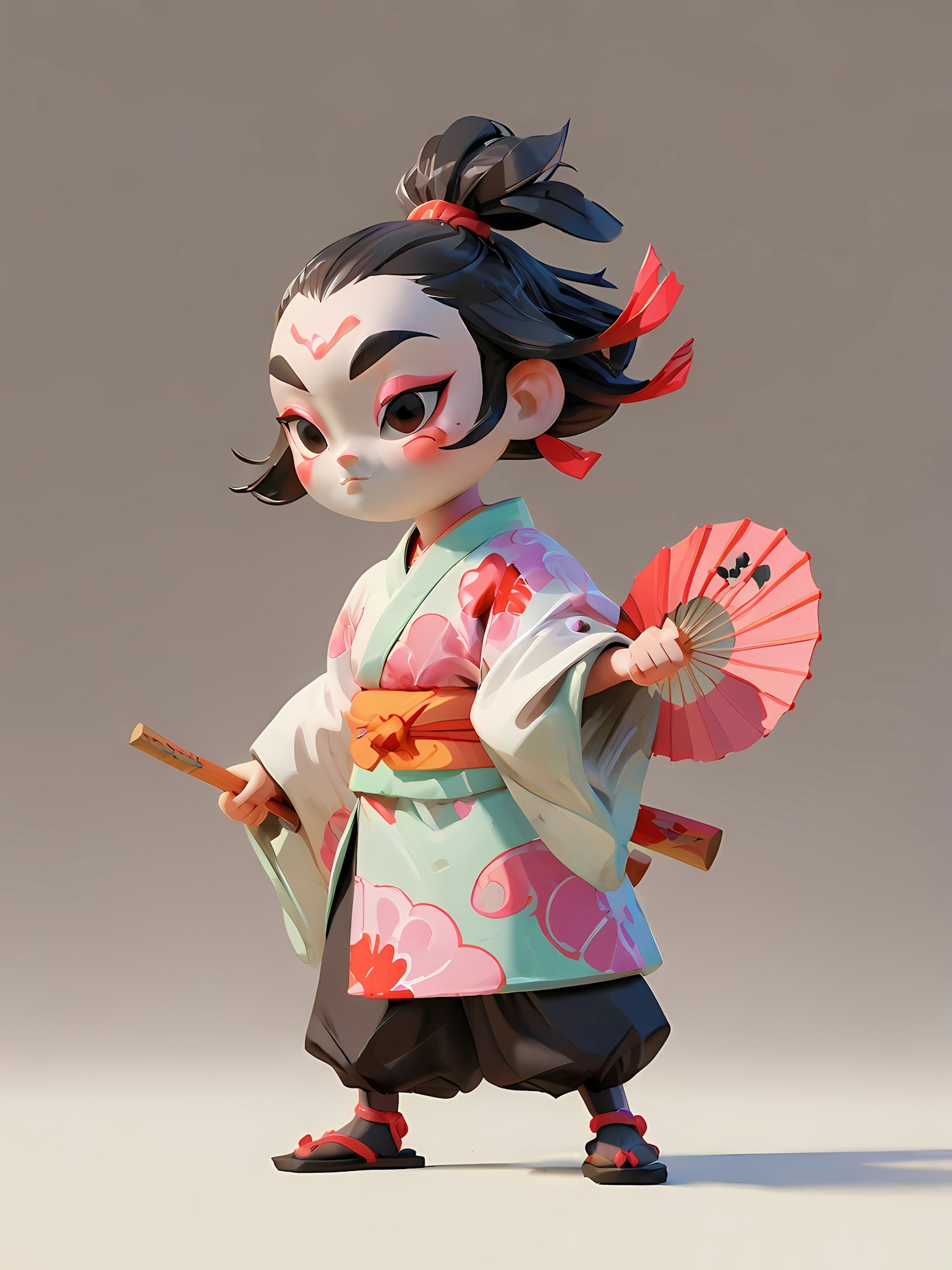 Stylized 3D anime-inspired character in a floral kimono, holding a red fan and wooden stick, exuding charm and tradition.