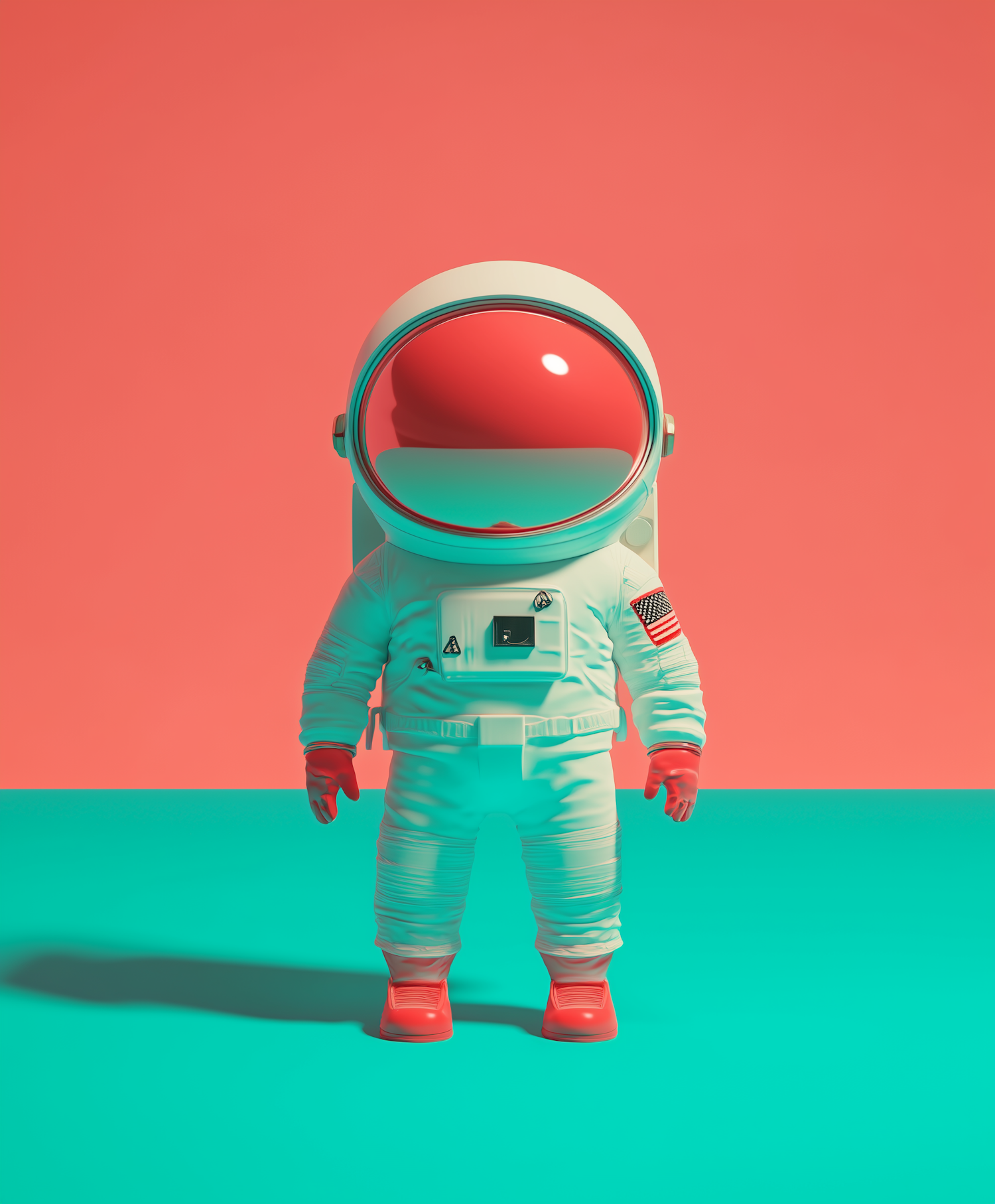 Stylized astronaut in a white suit with red accents against a coral and turquoise background, featuring a reflective helmet.