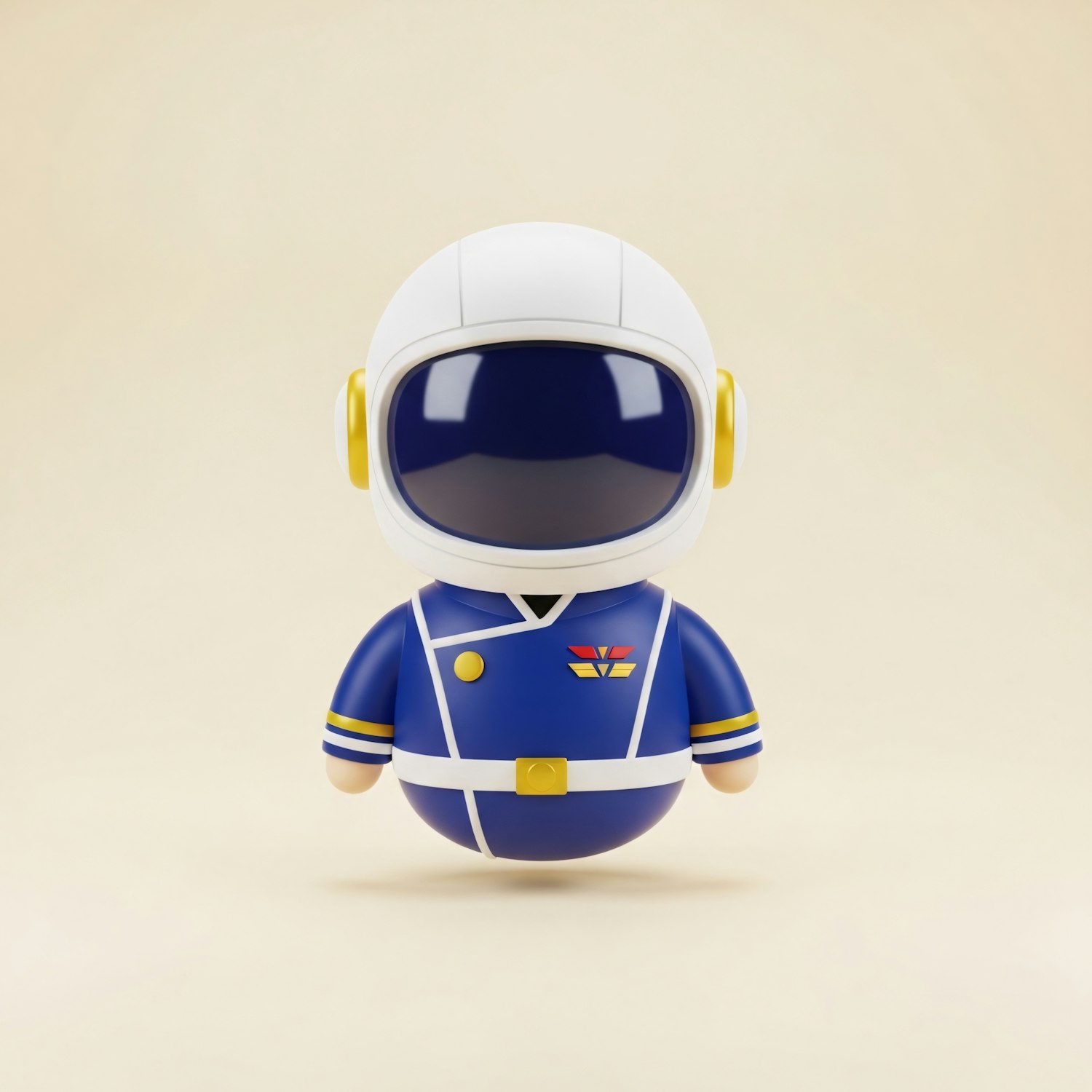 A cute astronaut figurine in a blue suit with a large helmet visor, set against a simple beige background.