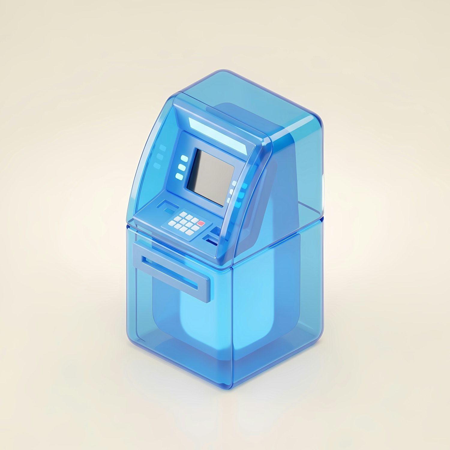 A sleek 3D-rendered translucent blue ATM machine on a neutral background, showcasing a modern and minimalistic design.