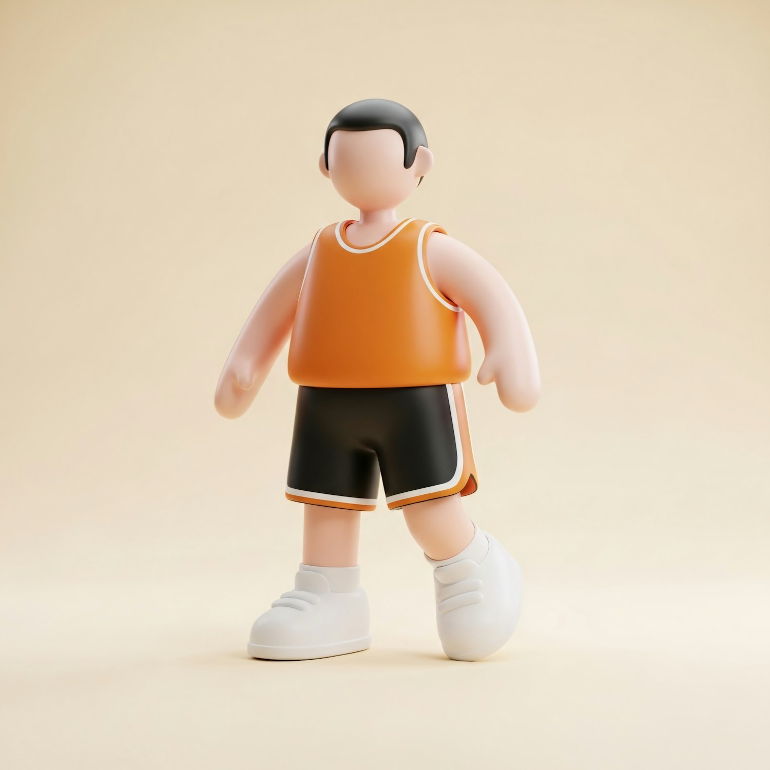 A minimalistic 3D character in a basketball uniform, featuring an orange jersey and black shorts, set against a neutral beige background.