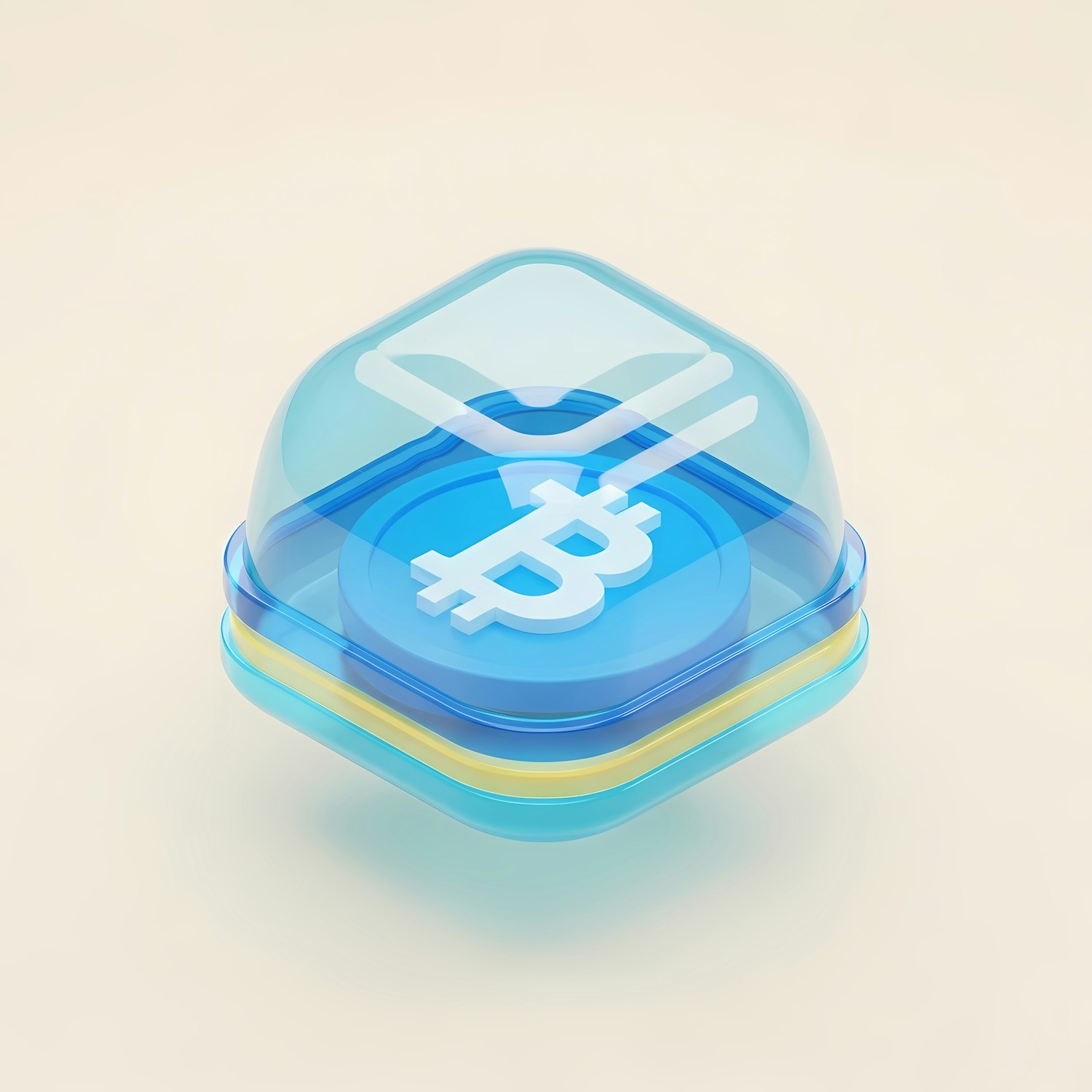A 3D-rendered Bitcoin logo encased in a transparent, layered geometric structure with vibrant blue and yellow hues on a neutral background.