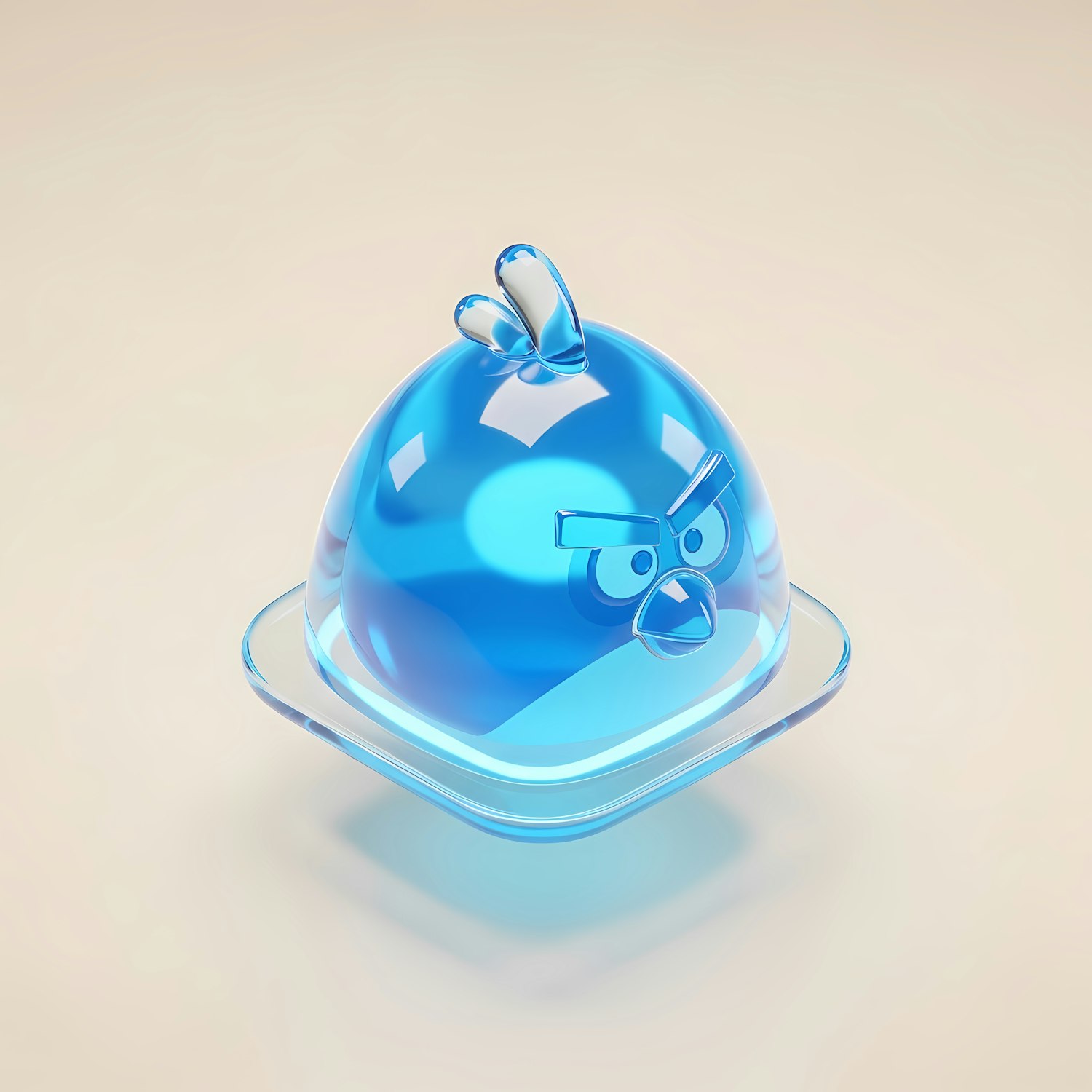 A glossy, translucent blue 3D bird with an angry expression, perched on a square base against a soft beige background.