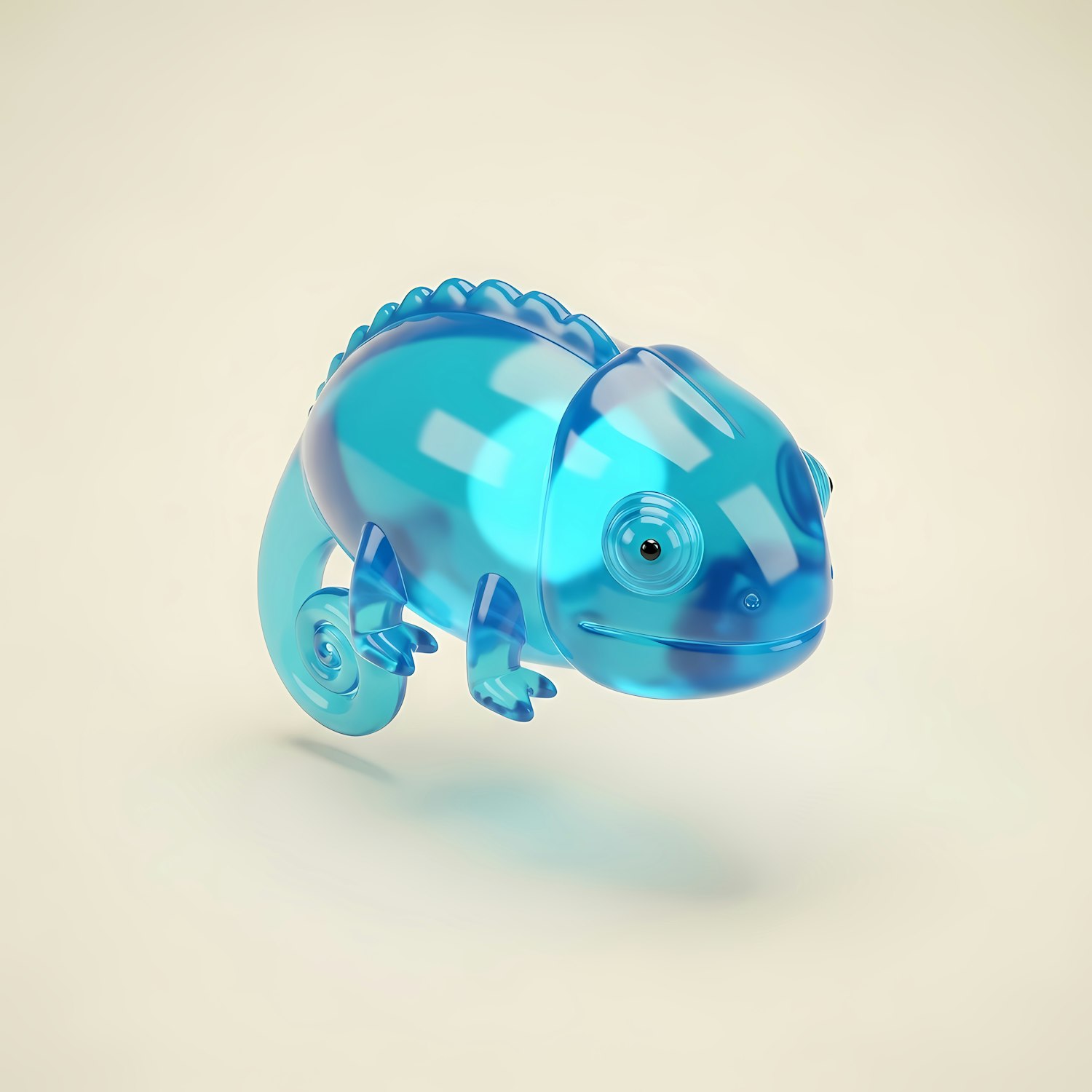 A vibrant 3D-rendered translucent blue chameleon with a glossy finish, set against a neutral beige background.