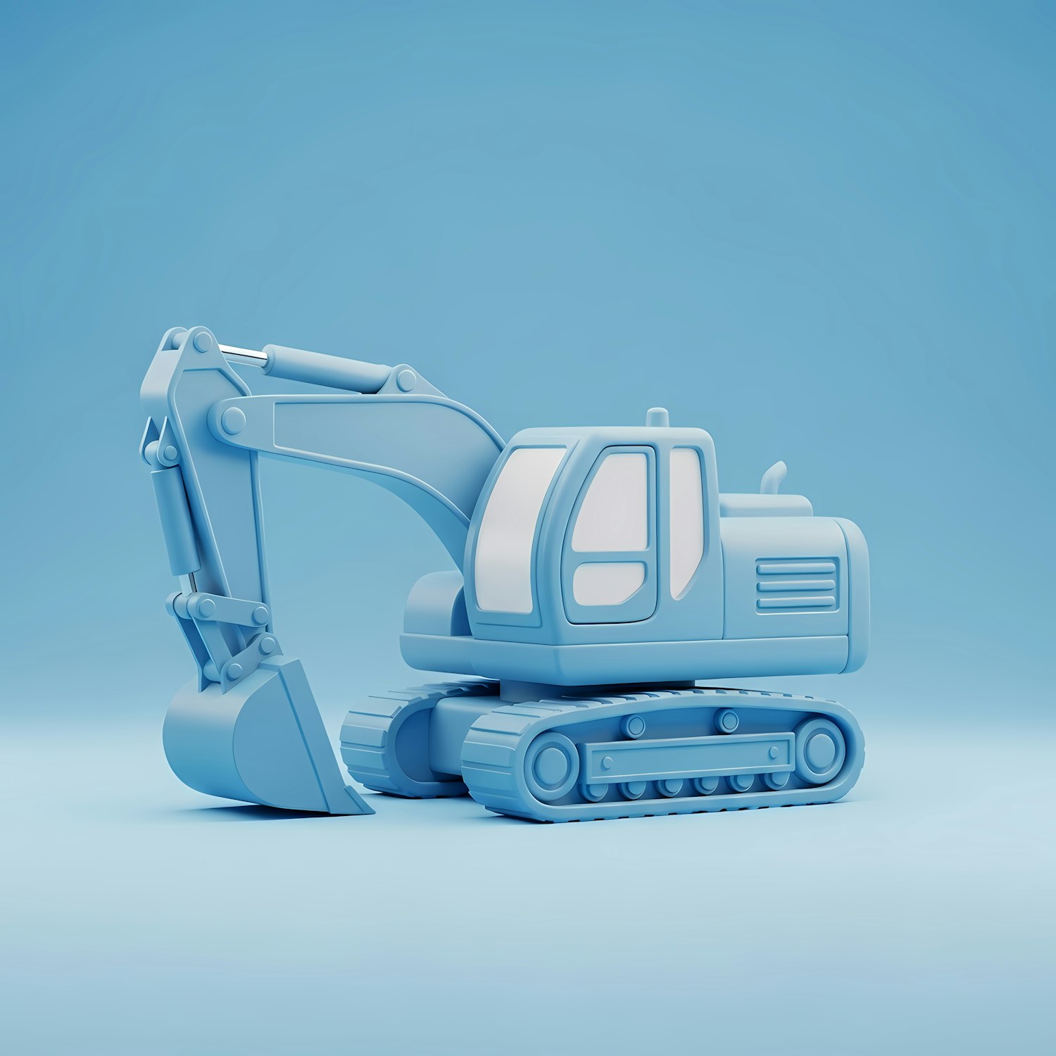 Stylized 3D illustration of a blue excavator with a clean, minimalistic design on a matching blue background.