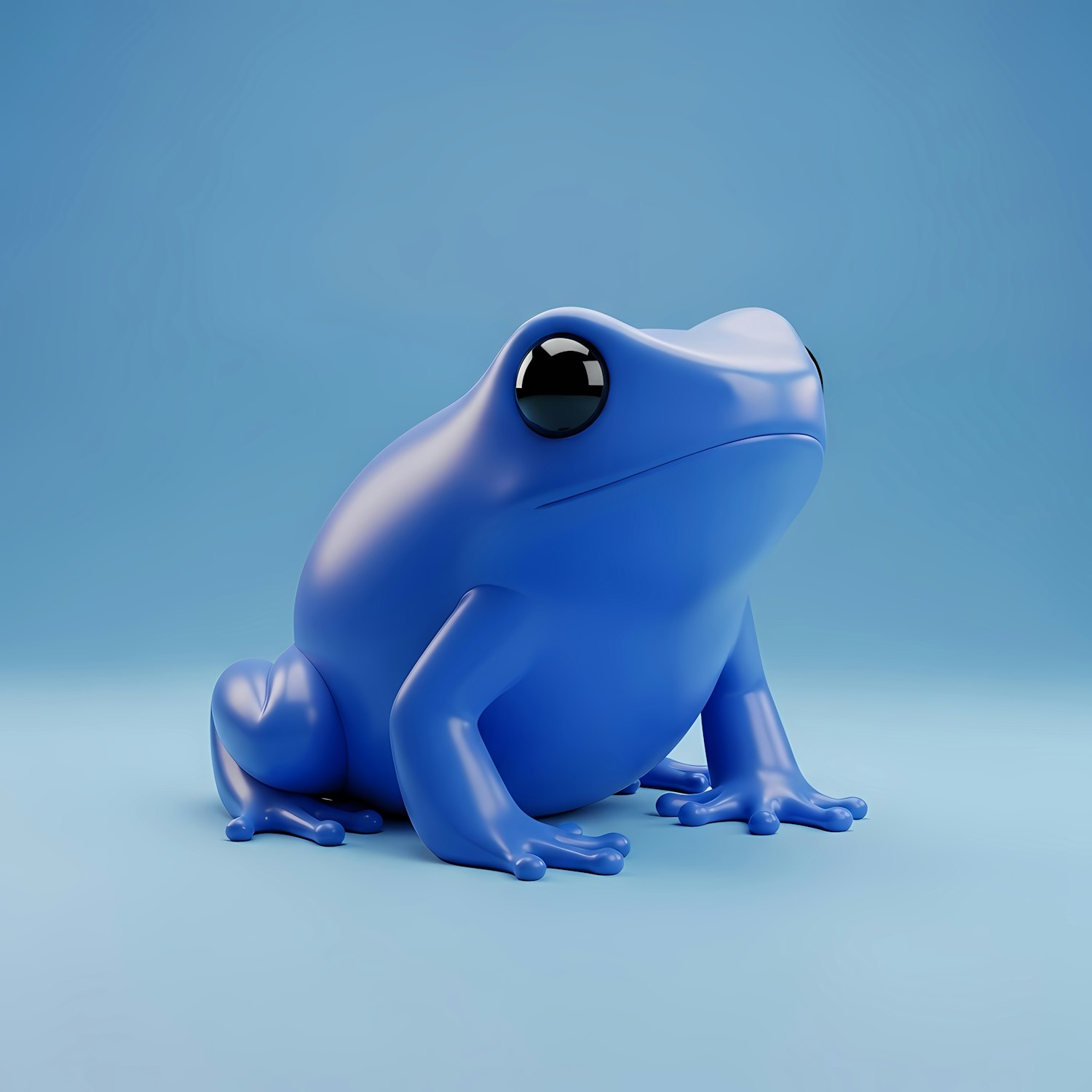 A vibrant 3D-rendered blue frog with glossy black eyes sits against a gradient blue background, showcasing a smooth and stylized design.