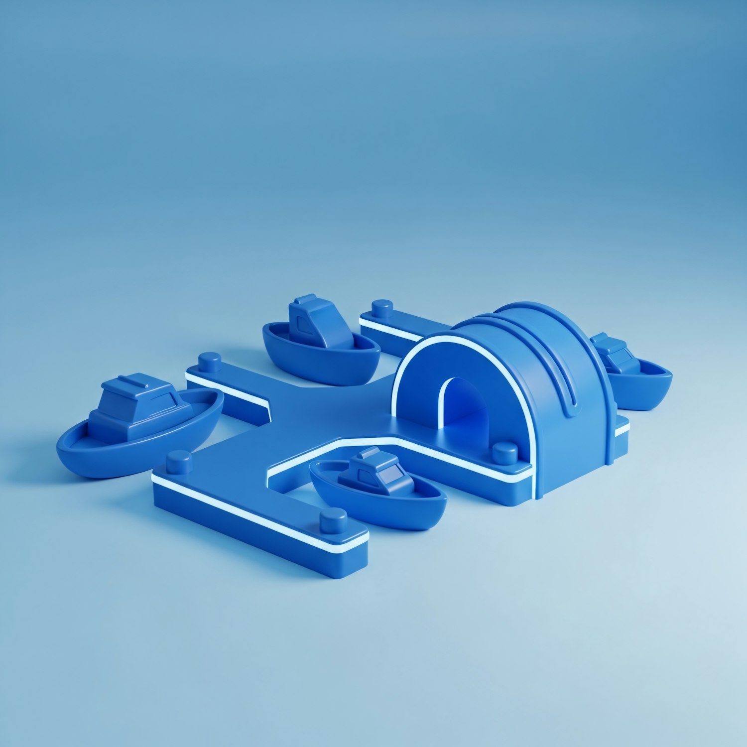 A modern 3D-rendered scene of a blue harbor with boats and a dock, showcasing a clean and minimalistic design.