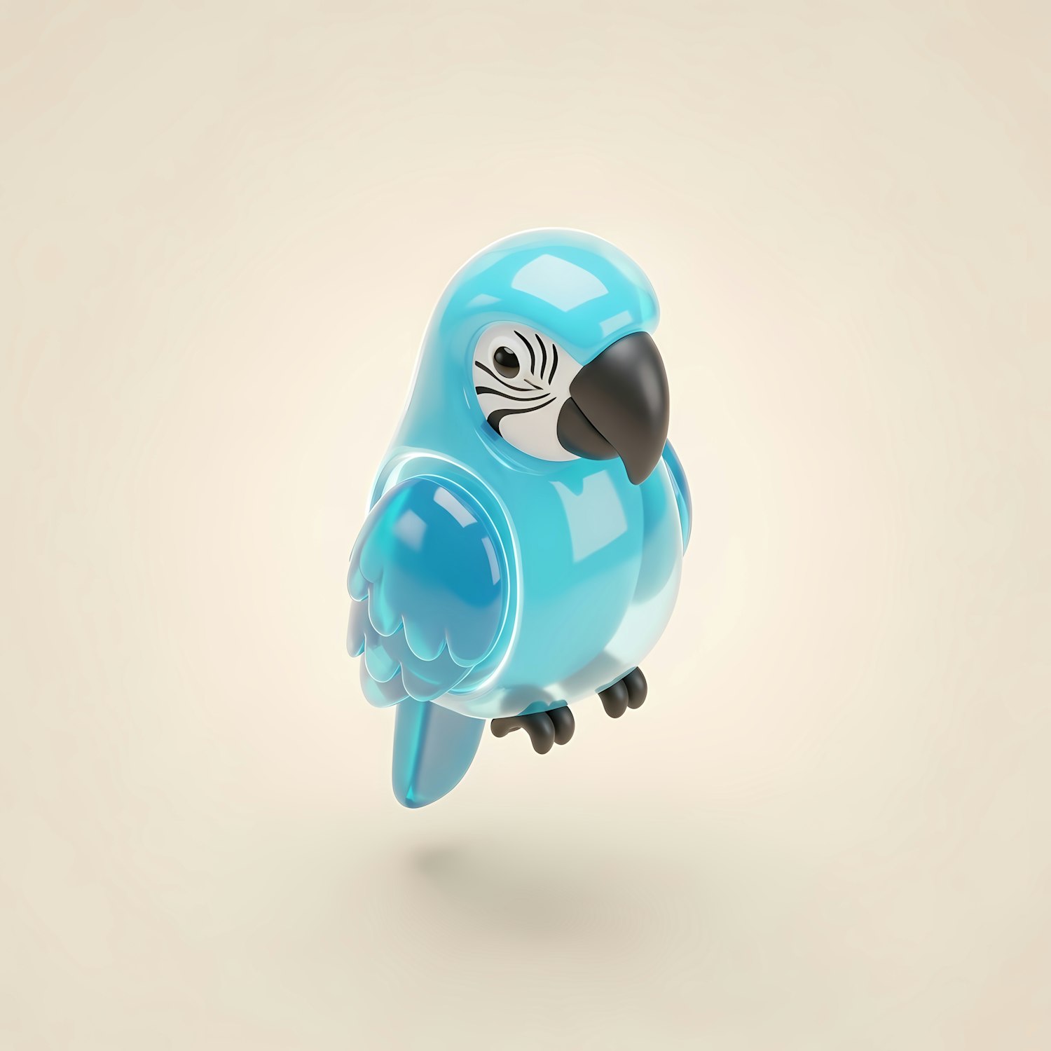 A vibrant 3D-rendered blue parrot with a glossy finish, black beak, and intricate eye markings, set against a neutral background.