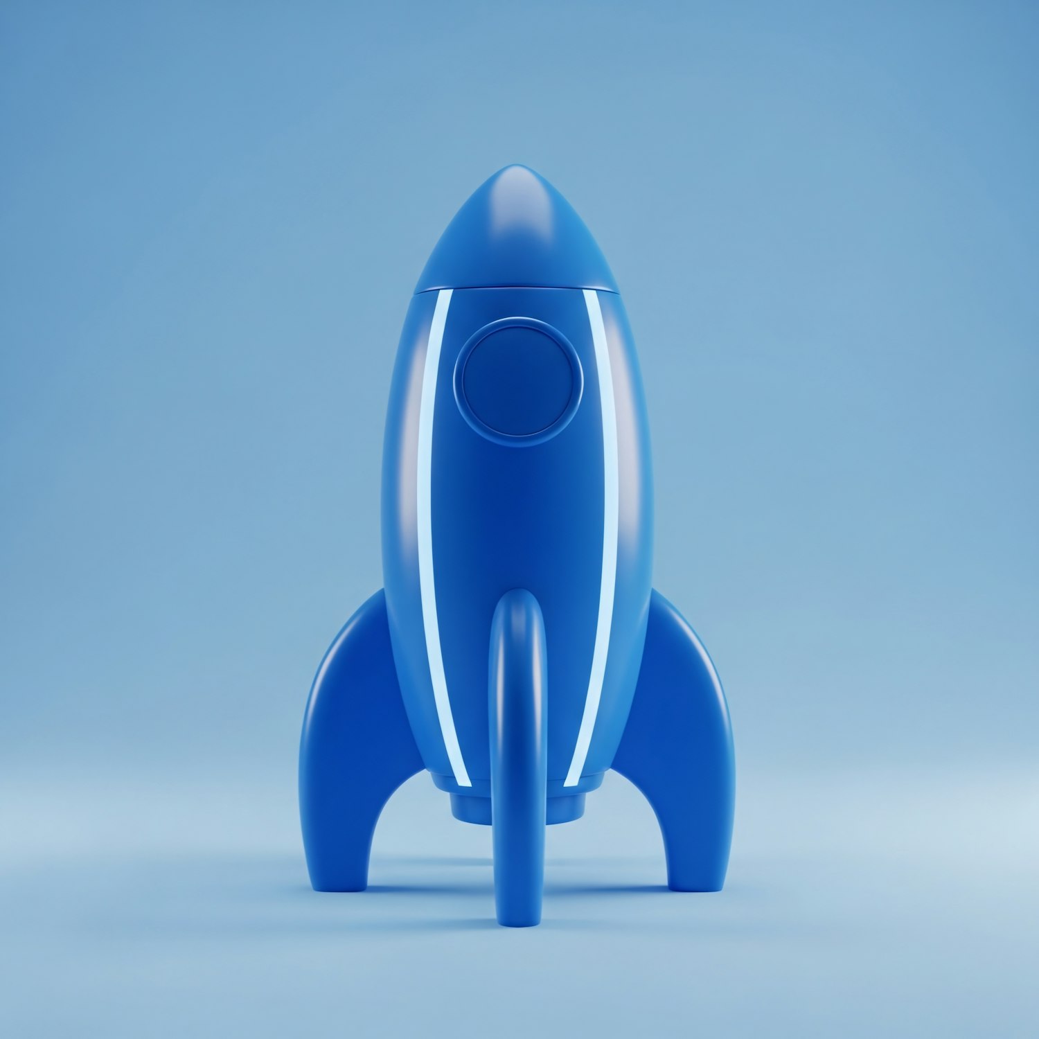 A sleek blue rocket model with white accents stands against a matching blue background, showcasing a modern and polished design.