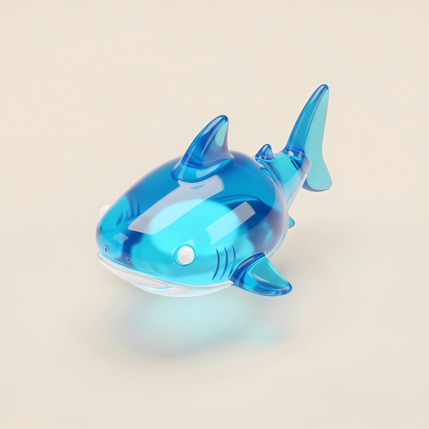A cute, glossy blue 3D shark figure with a playful design on a light beige background, perfect for creative or aquatic-themed projects.