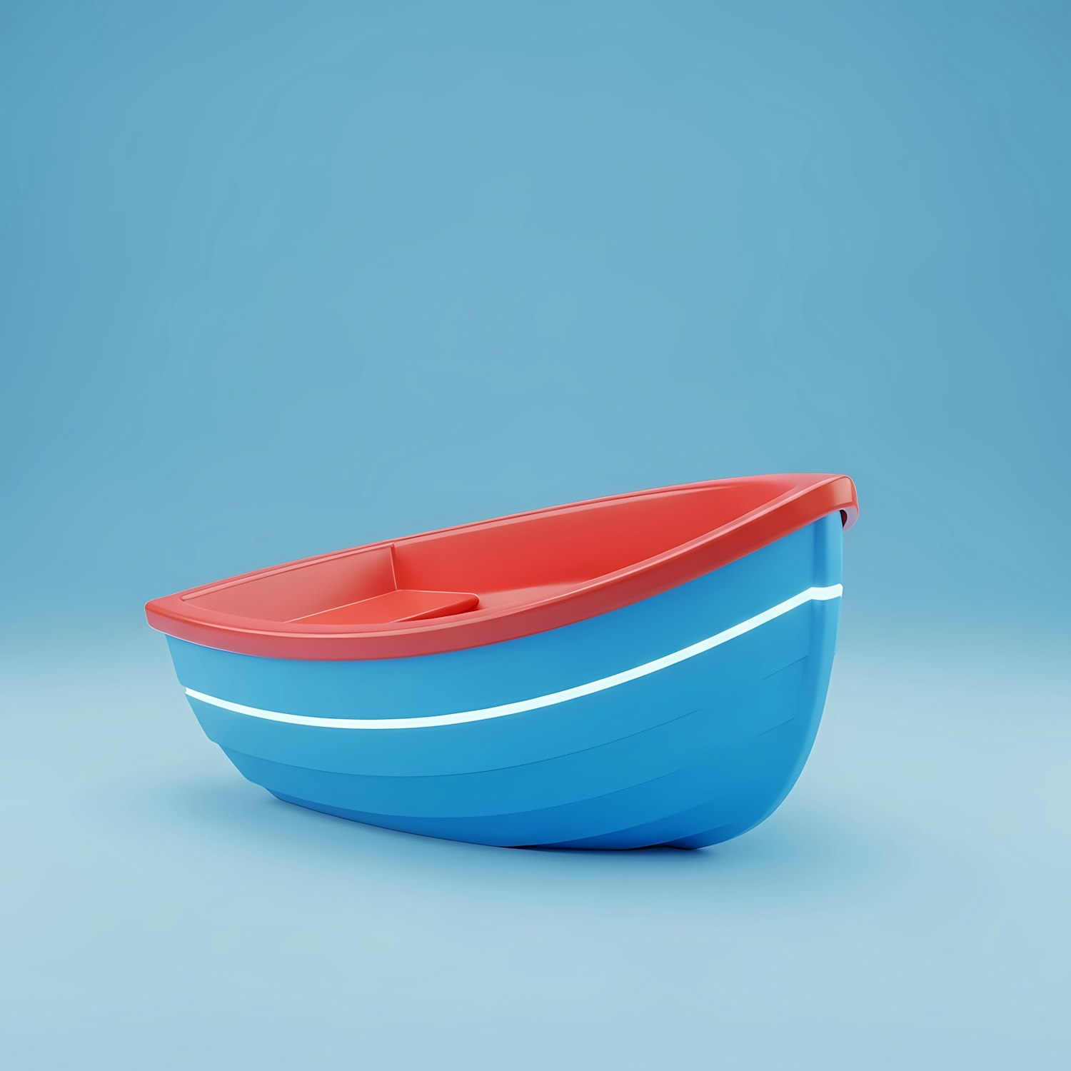 Bright 3D-rendered boat with a red interior and blue exterior, set against a clean light blue background. Perfect for design inspiration.