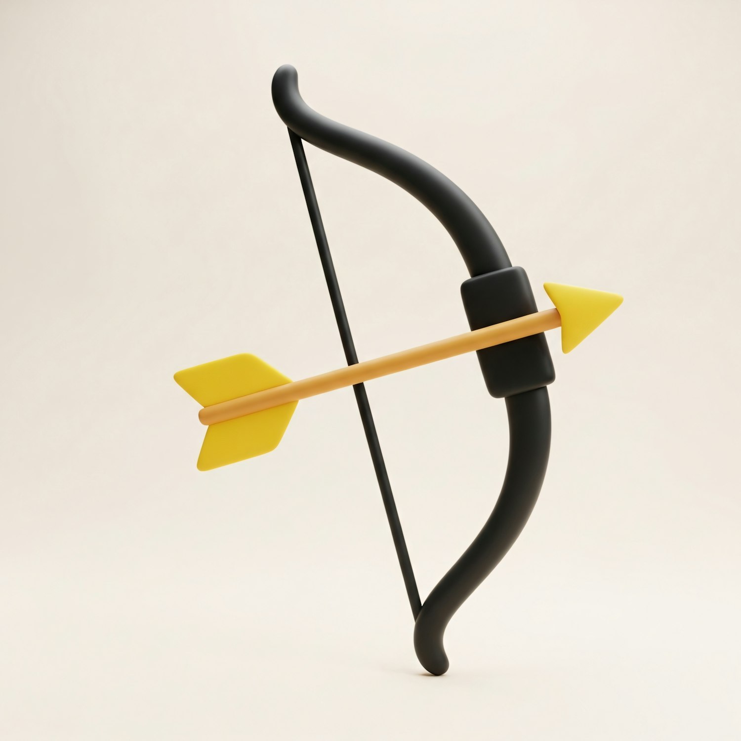 A sleek 3D-rendered black bow with a yellow arrow against a neutral background, showcasing a modern and minimalistic design.
