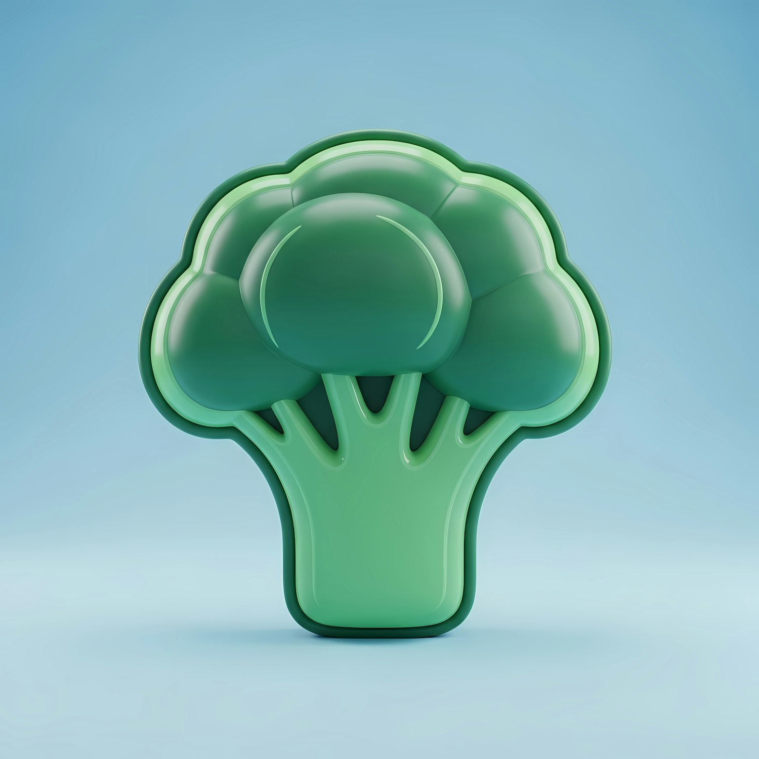 Stylized 3D broccoli icon with a glossy green finish on a light blue gradient background, perfect for healthy food themes.