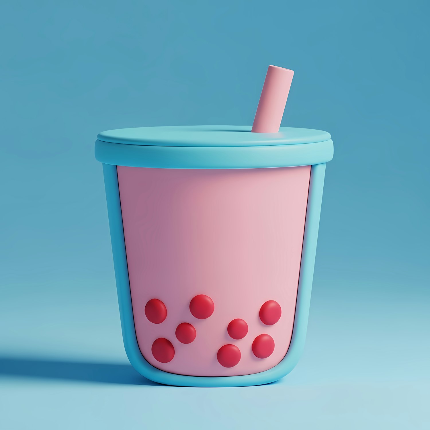 Stylized 3D bubble tea cup with pink and blue tones, featuring red tapioca pearls and a matching straw on a light blue background.
