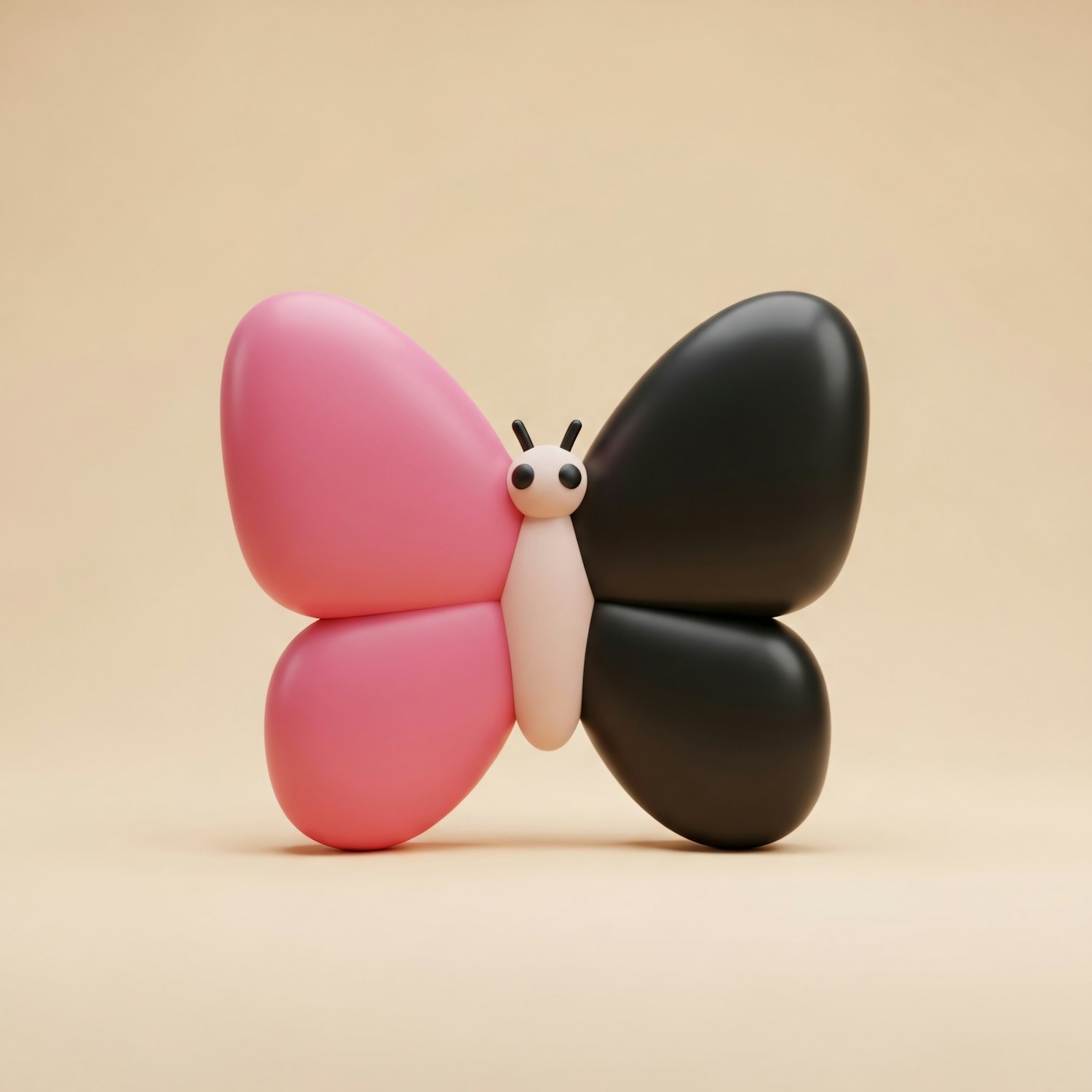 A minimalist butterfly sculpture with pink and black wings on a beige background, showcasing a modern and playful design.