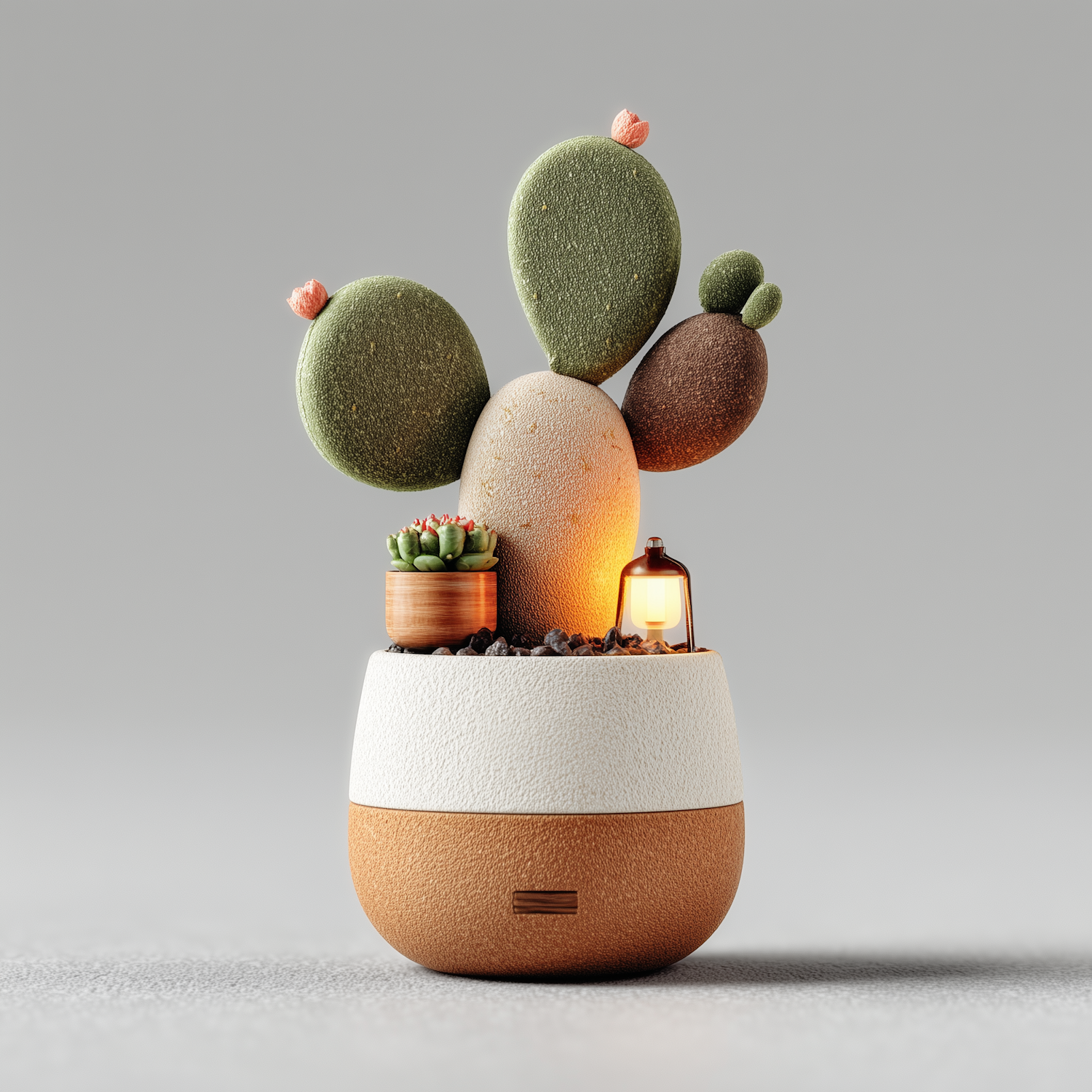 A modern 3D cactus arrangement with a glowing lantern and succulent in a stylish pot, perfect for adding charm to any space.