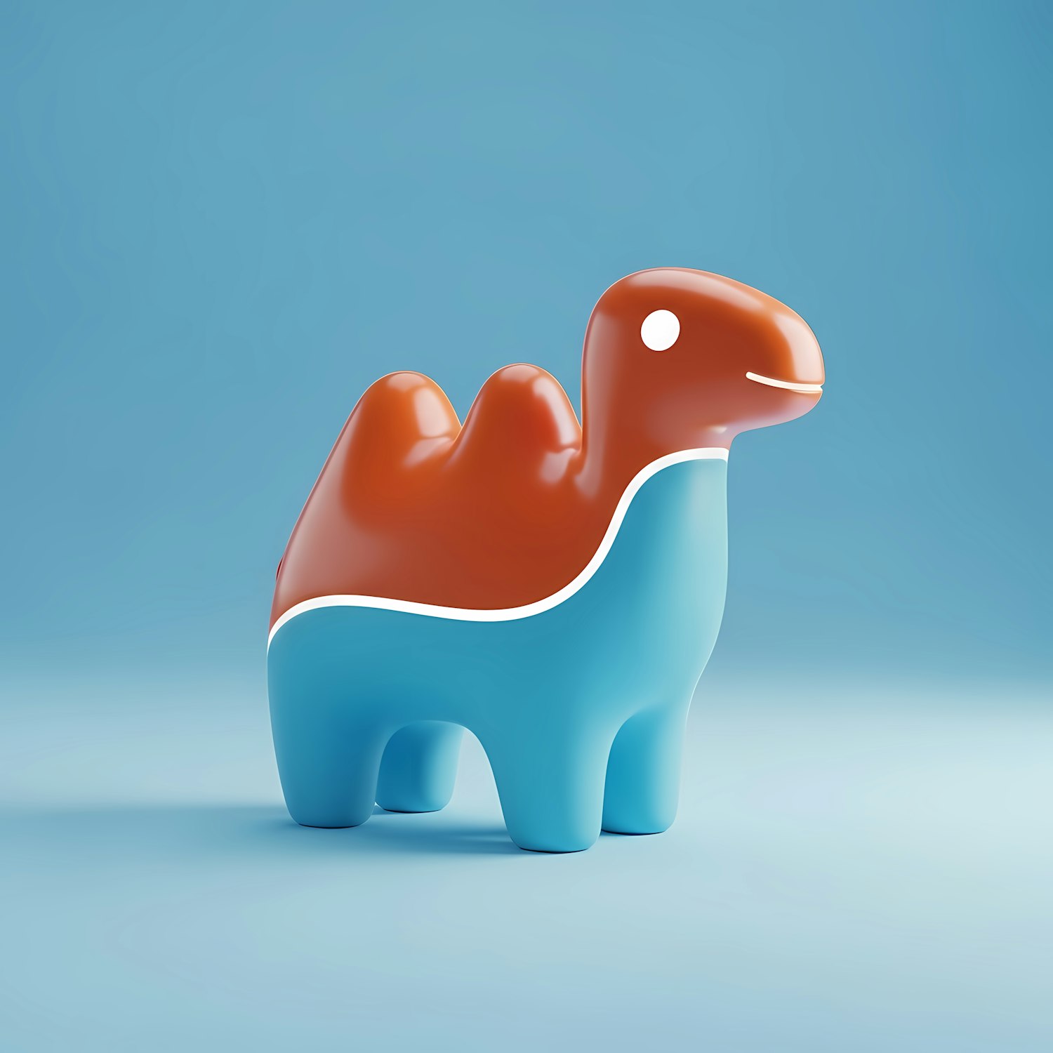 A minimalist 3D-rendered camel figurine in blue and orange with a glossy finish, set against a light blue gradient background.