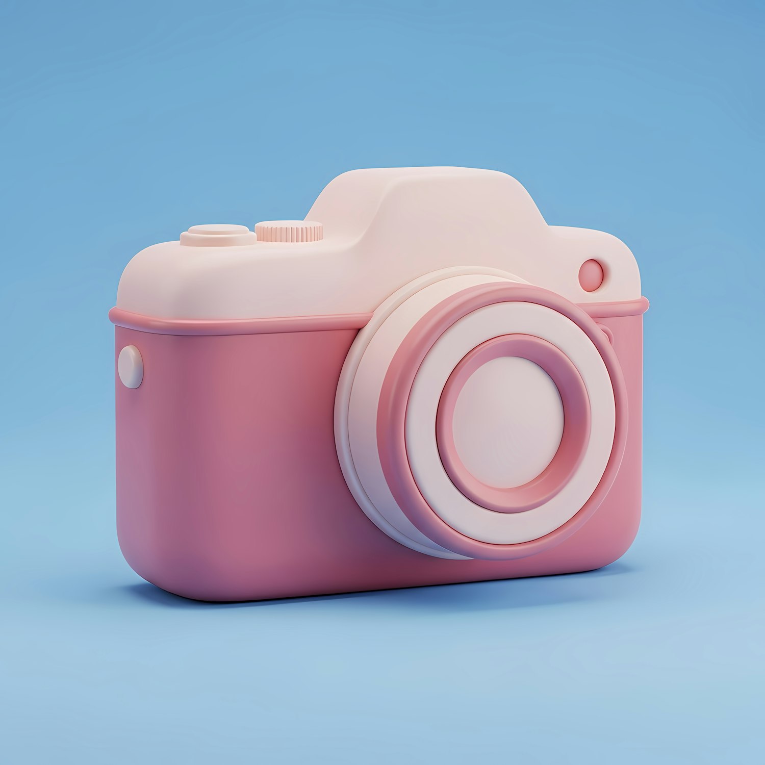 A cute 3D-rendered pink and white camera with a toy-like design, set against a light blue background. Perfect for creative projects.