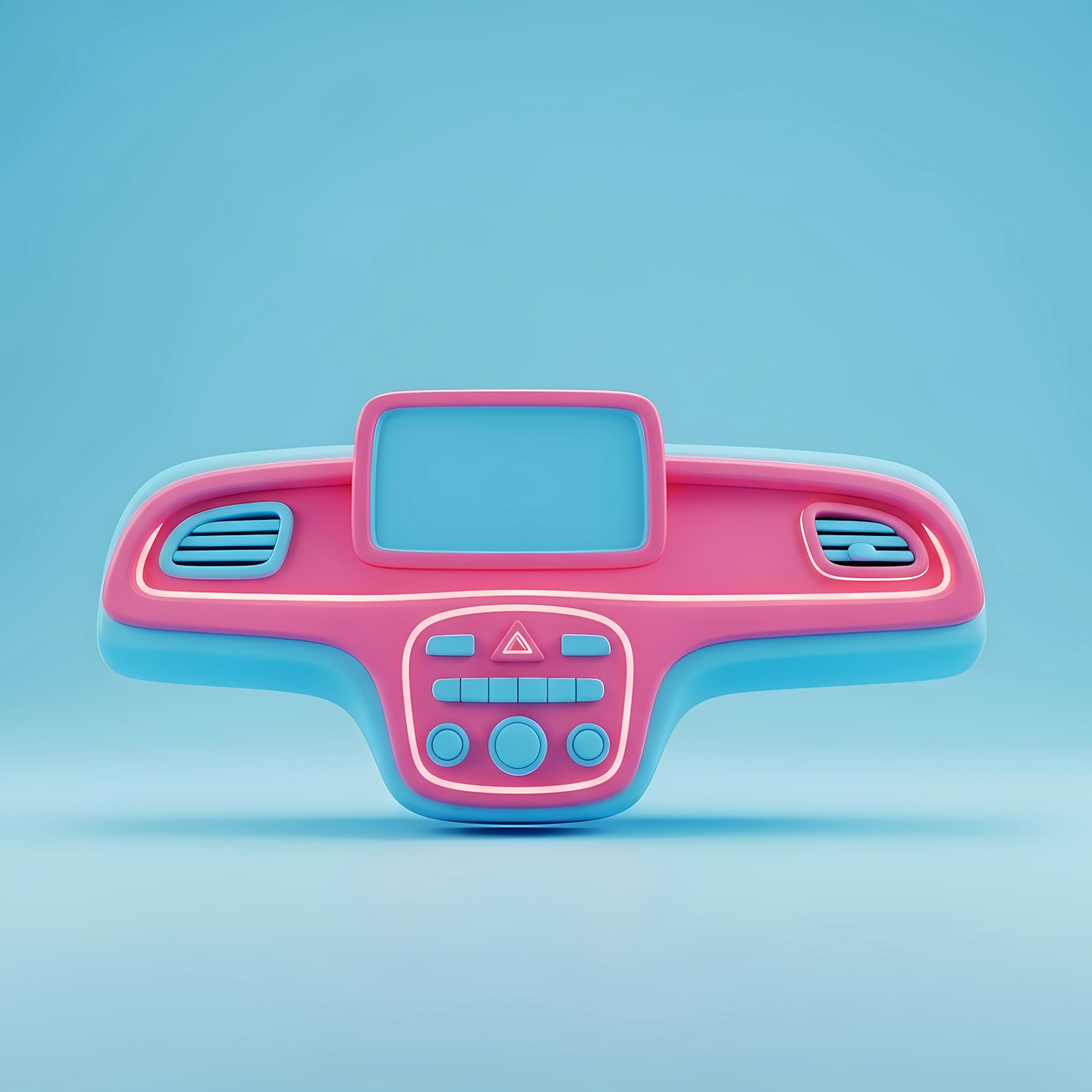 Vibrant 3D illustration of a pink and blue car dashboard with a playful, minimalistic design and smooth, rounded edges.