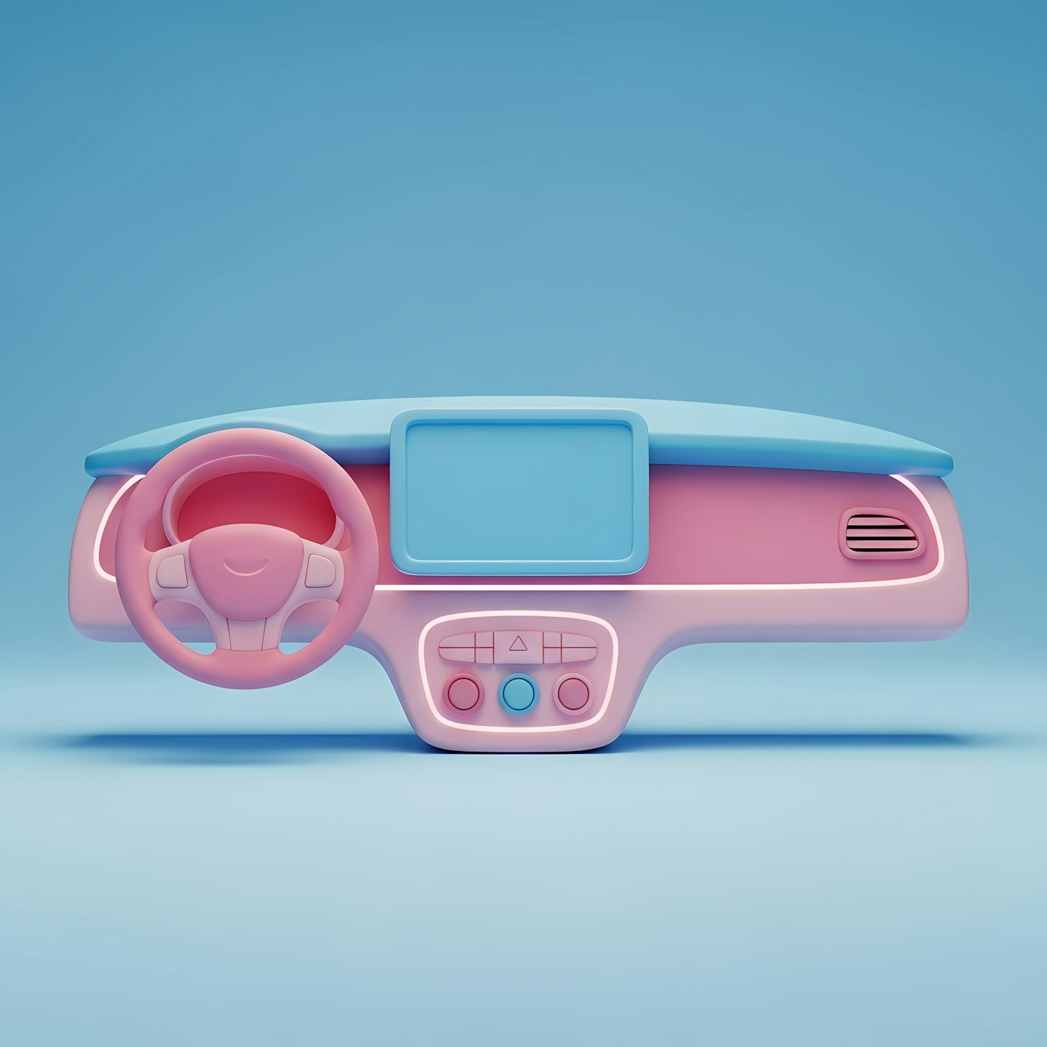 Stylized 3D car dashboard in pastel pink and blue tones, featuring a steering wheel, central screen, and controls. Minimalist and modern design.
