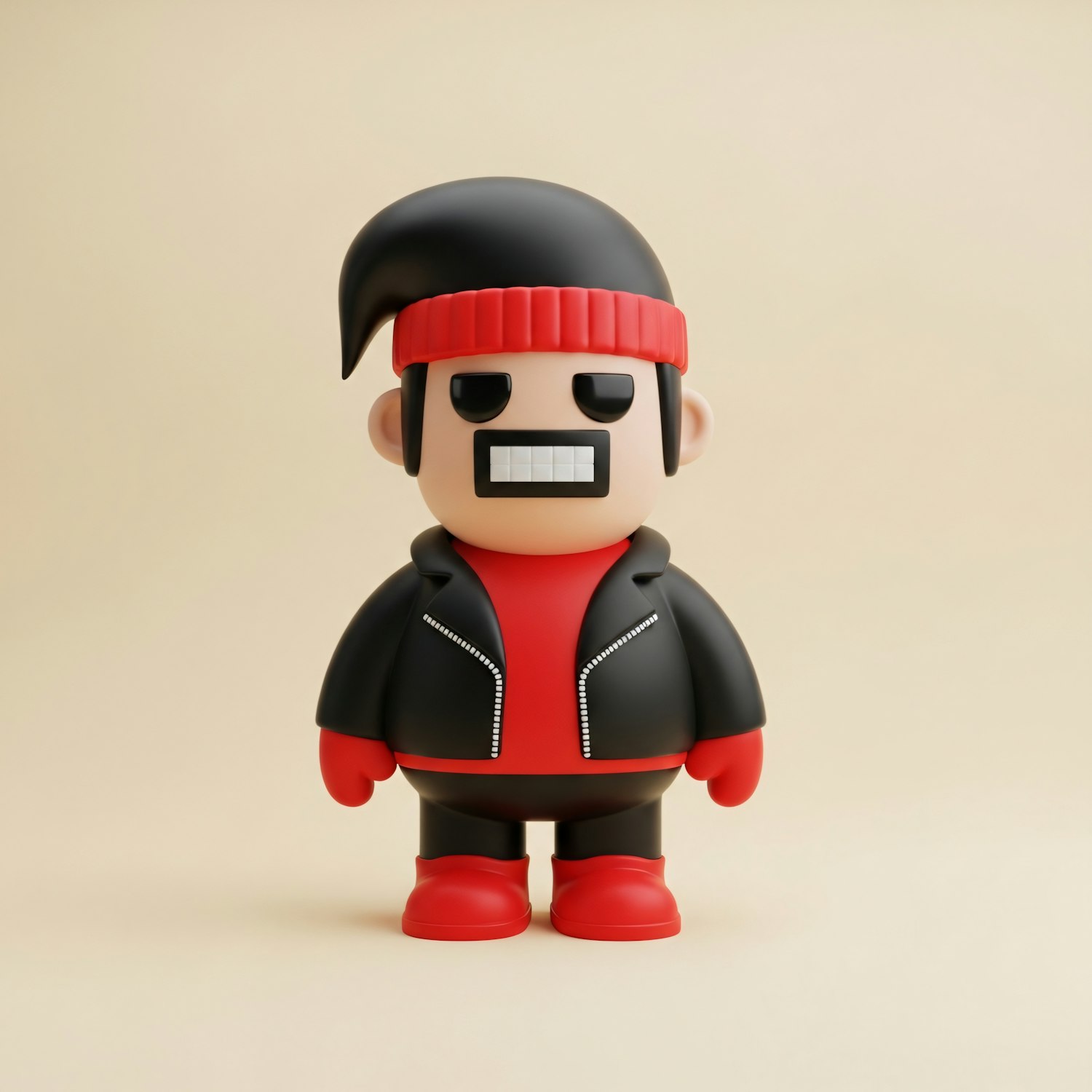 A stylized cartoon character with bold colors, wearing a black jacket and red accessories, set against a neutral background.