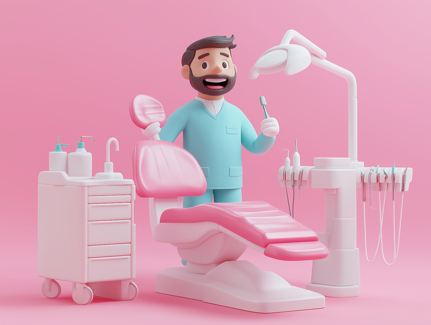 Cartoon dentist in a pink-themed dental office, holding a toothbrush. Features a pink dental chair and various dental tools.