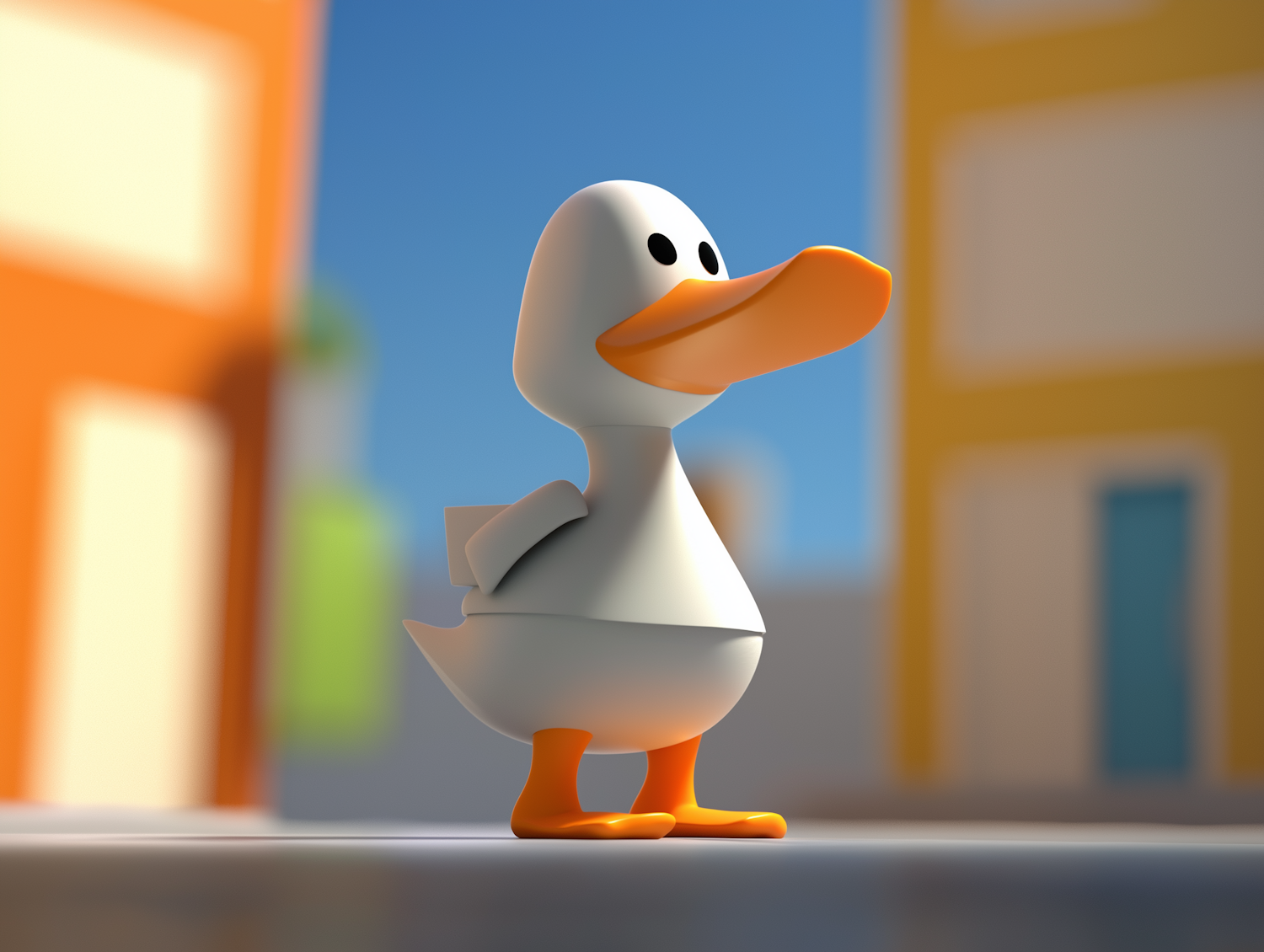 Charming 3D cartoon duck with an orange beak in a colorful urban setting, exuding playful and whimsical vibes.