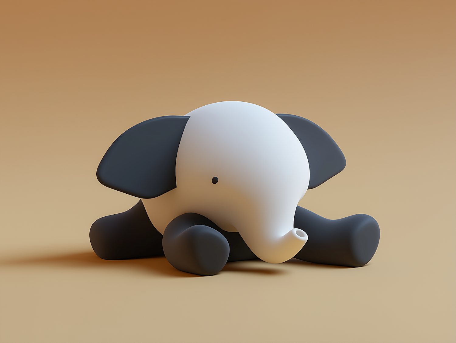 Adorable 3D-rendered baby elephant with a white body and dark gray features on a warm beige background, exuding charm and tranquility.