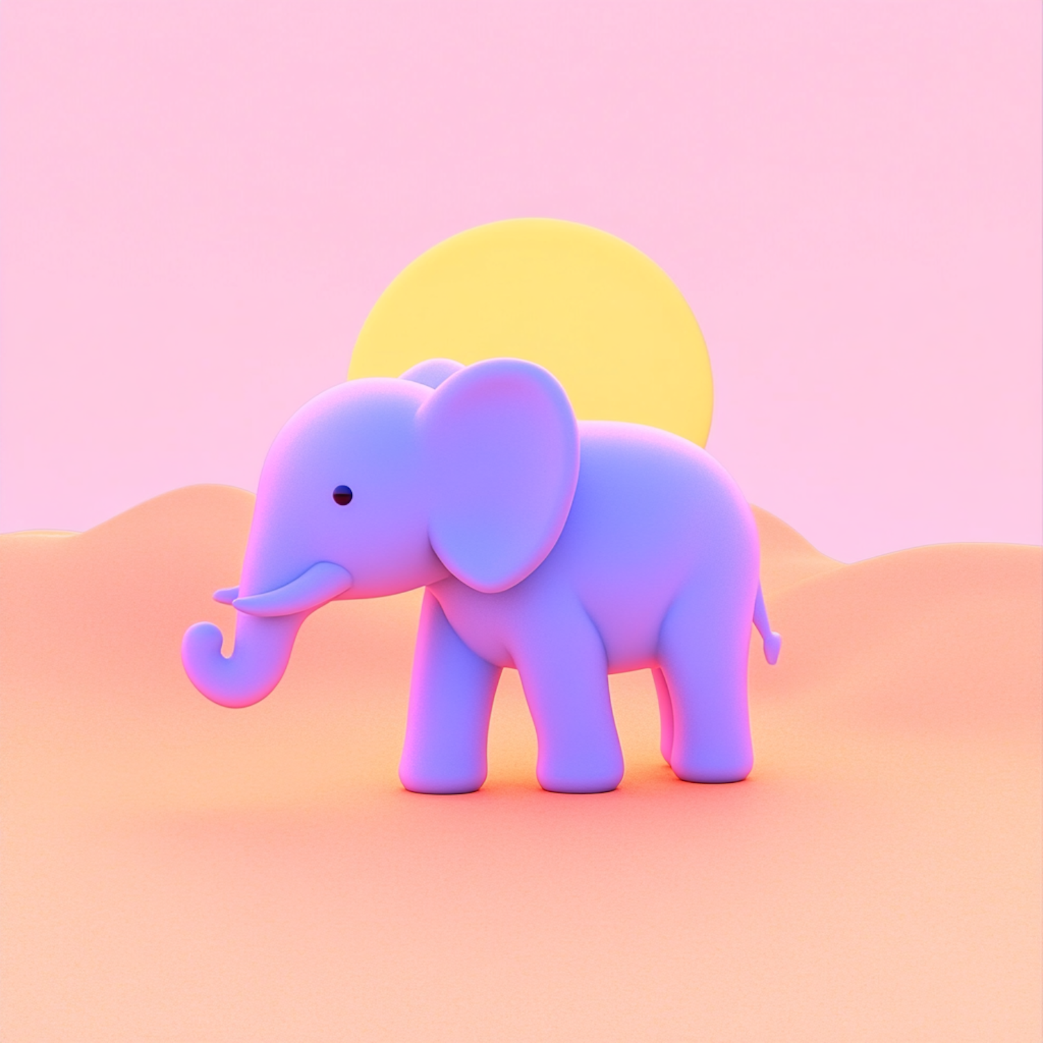 Whimsical 3D illustration of a purple cartoon elephant on a pastel landscape with a pink sky and yellow sun.