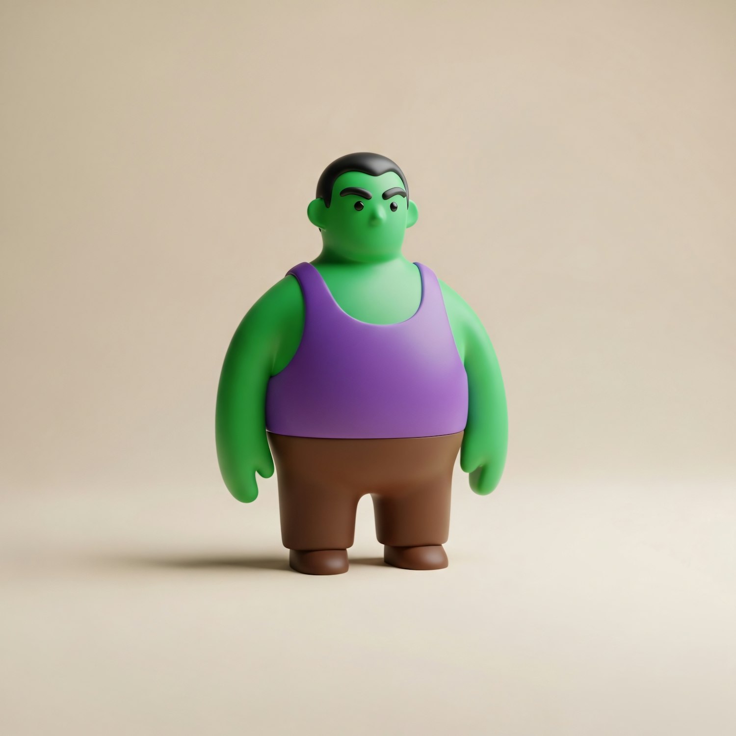 A colorful cartoon figure with a green body, purple tank top, and brown pants, set against a neutral beige background.
